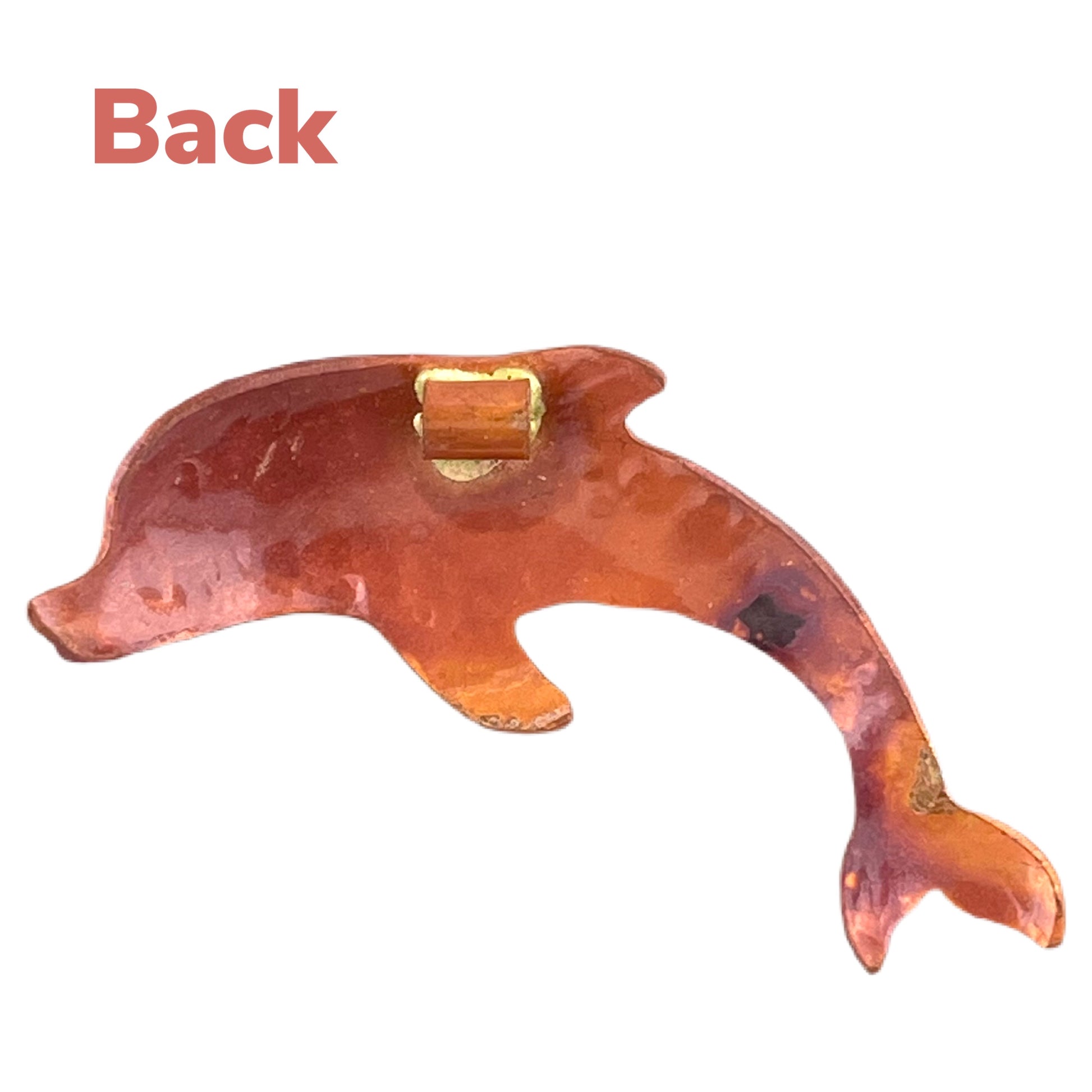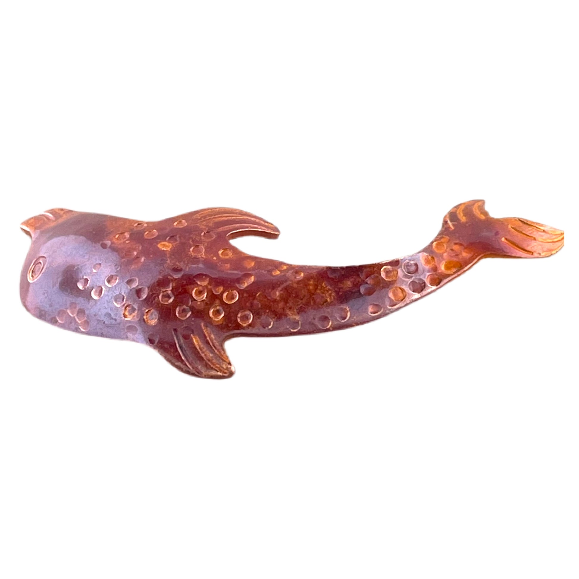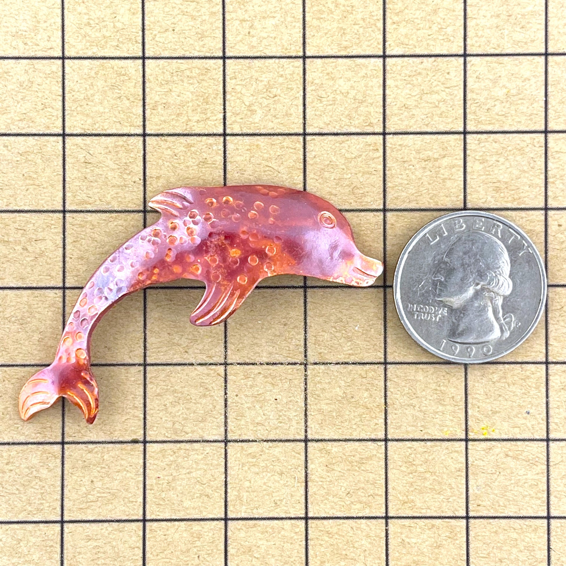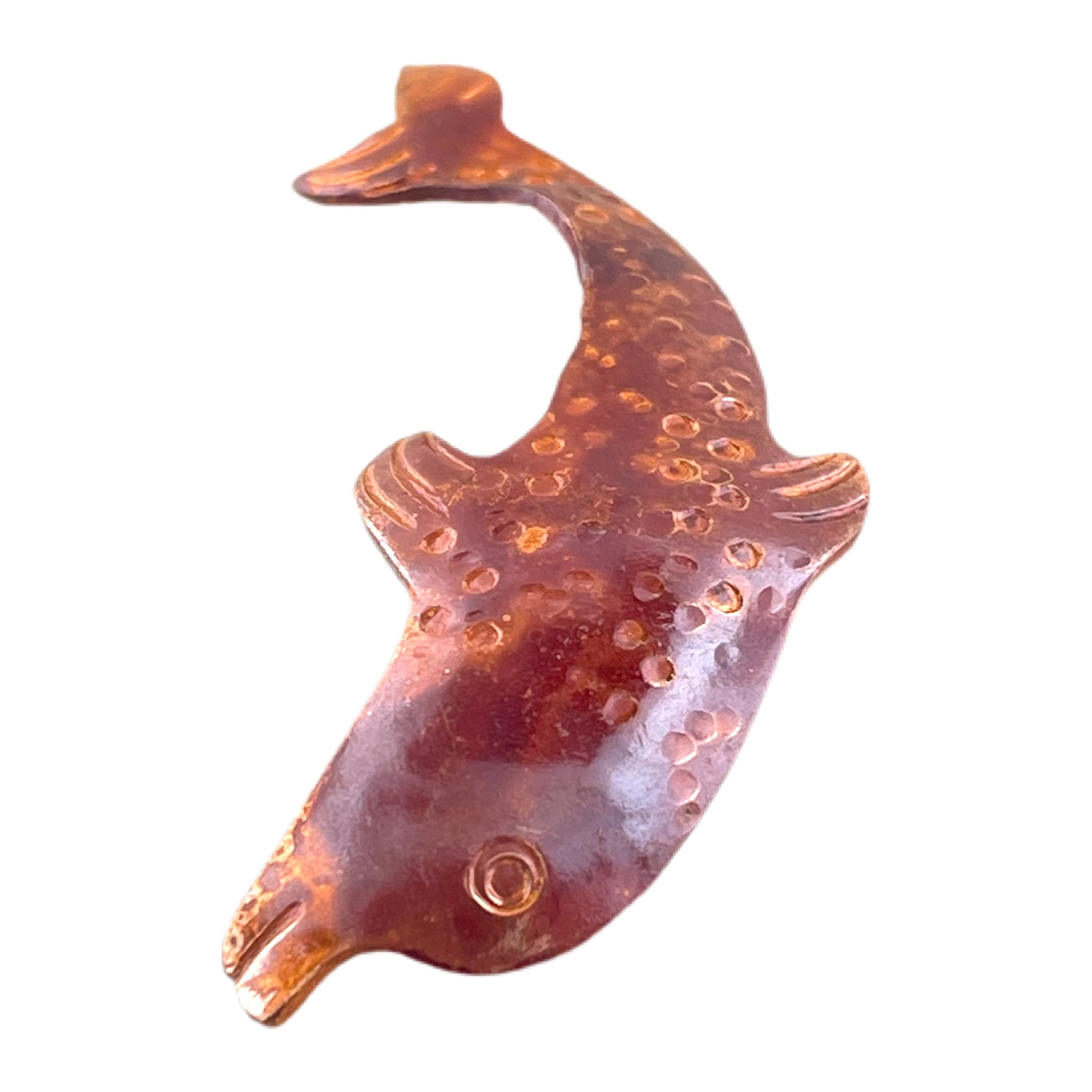 Playful and graceful, dolphins have long been regarded as messengers of the gods in ancient lore, symbolizing intelligence and harmony with the sea. This large copper dolphin pendant, crafted by Patricia Healey, showcases artisan craftsmanship using the traditional repoussé technique, where the copper is carefully lifted from the reverse side to form its flowing shape. Hand stamping adds detailed texture and dimension, while the heat-treated surface displays vibrant reds and oranges. Sealed with lacquer, the pendant maintains its rich colors and rustic beauty. Designed as a statement piece for necklaces, it’s perfect for those who cherish the ocean and its spirited creatures.