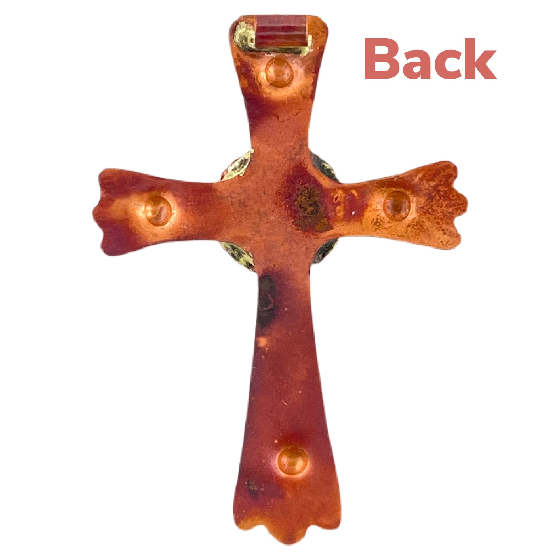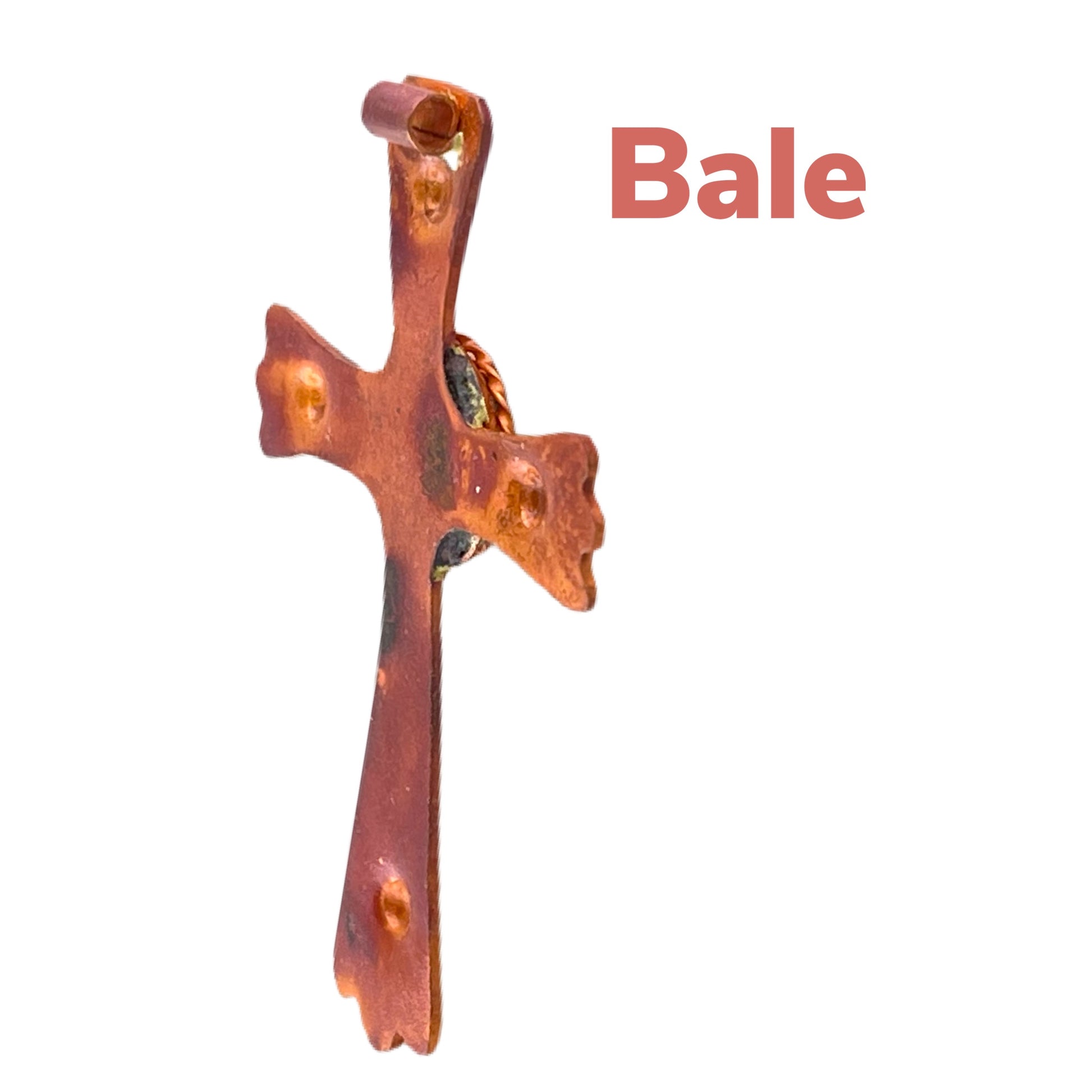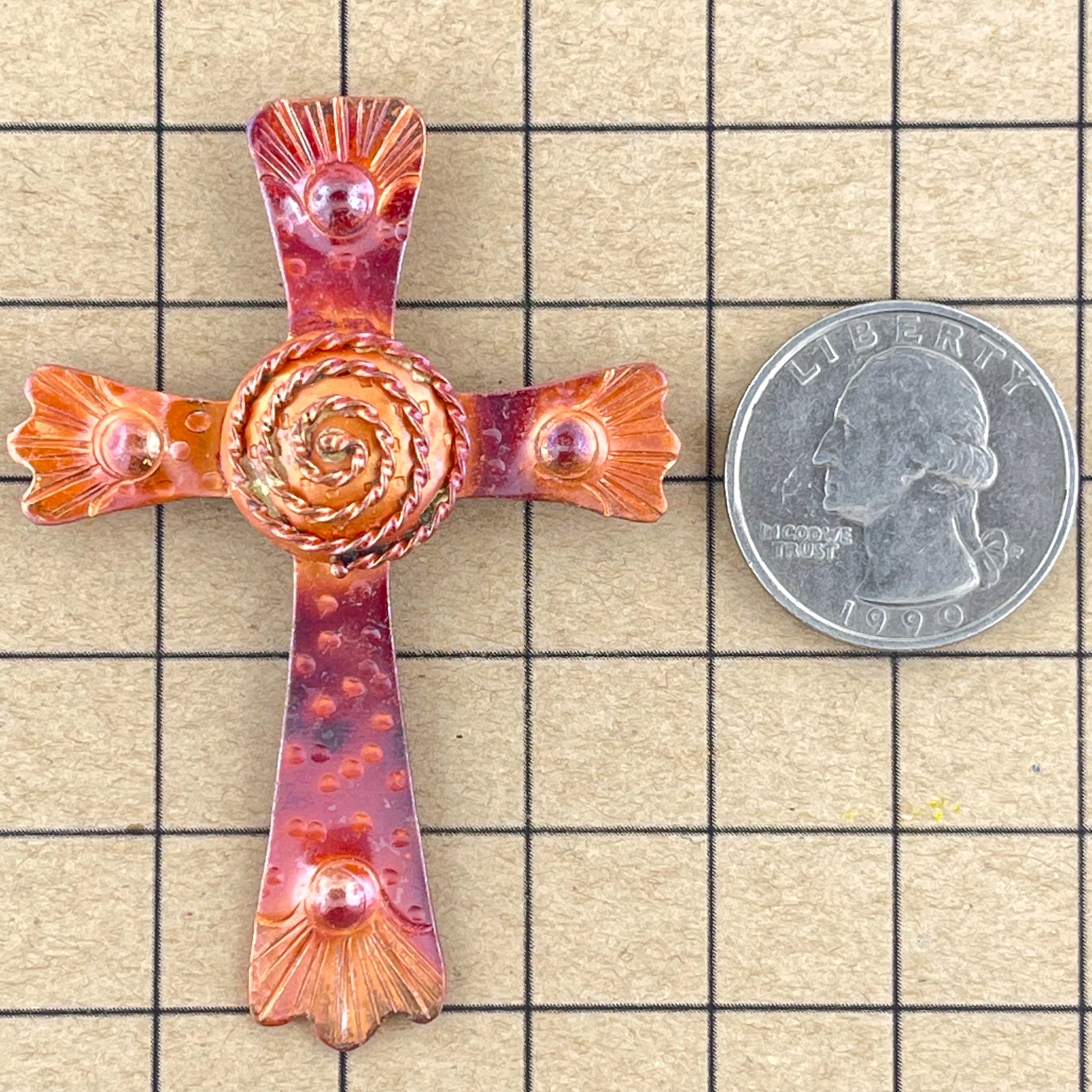 A radiant cross centered by a bold spiral, a form that feels both ancient and alive. The hand-forged copper surface is richly worked with repoussé and hammer marks, each stroke catching the light in warm red and orange tones brought out by flame. The spiral at the center adds a sense of movement and mystery, symbolizing faith’s unfolding path. Designed to fit a 2 mm cord or a beaded strand, it looks striking in a simple leather necklace or as the focal point in a beaded design.