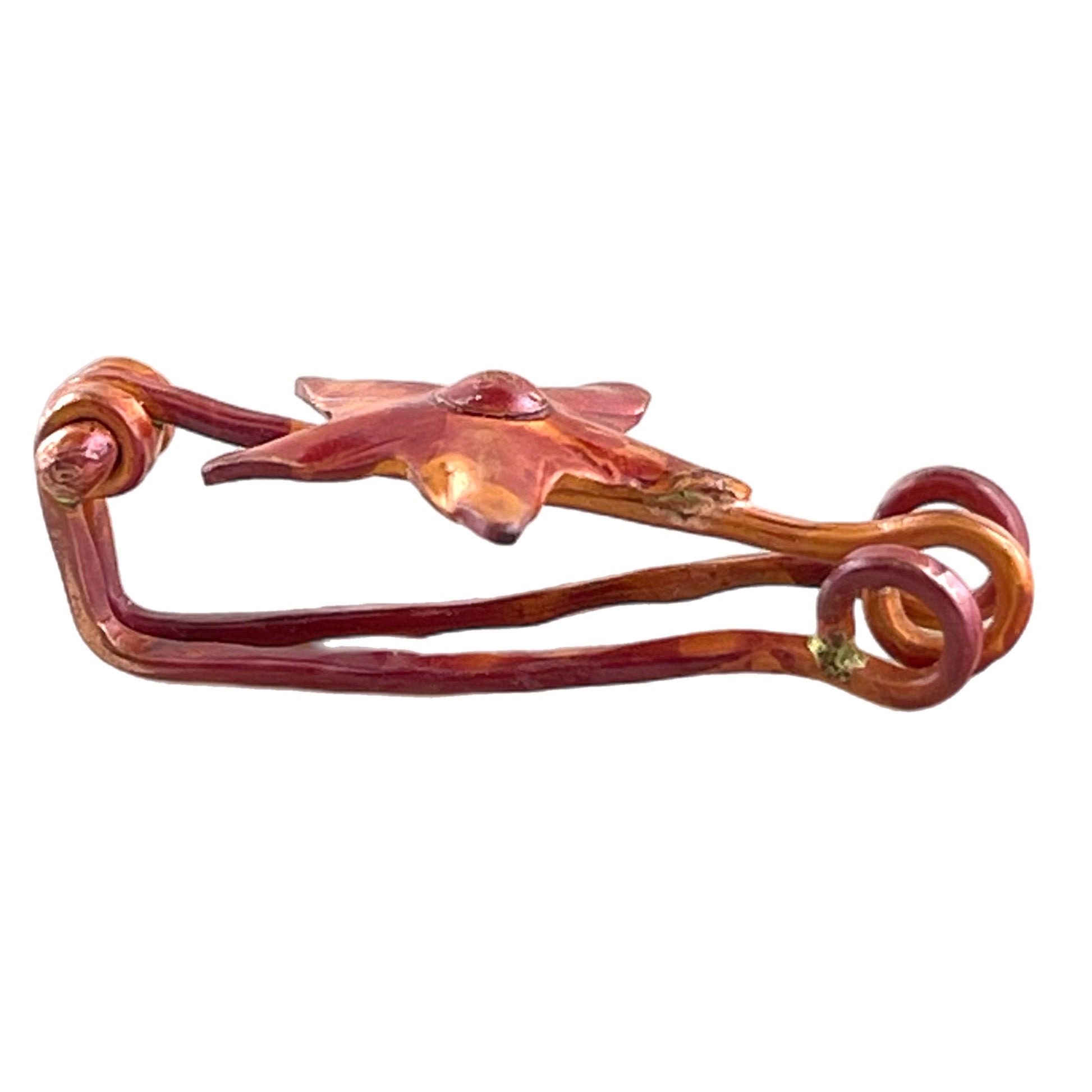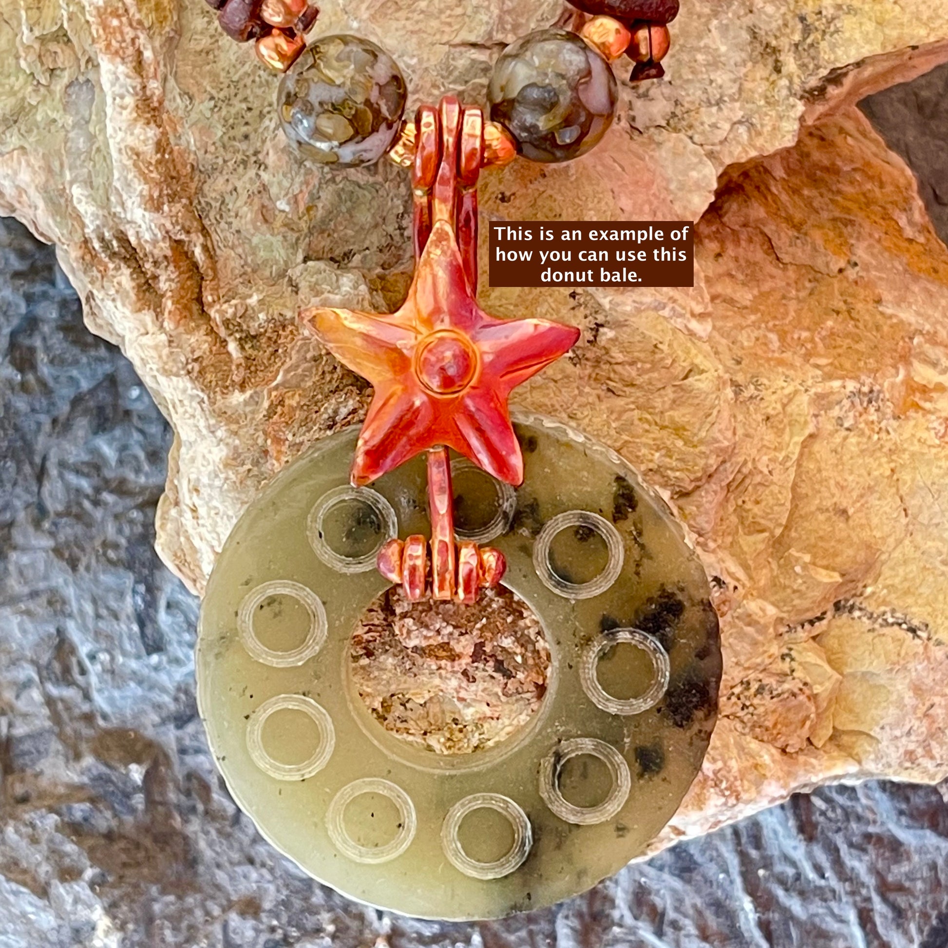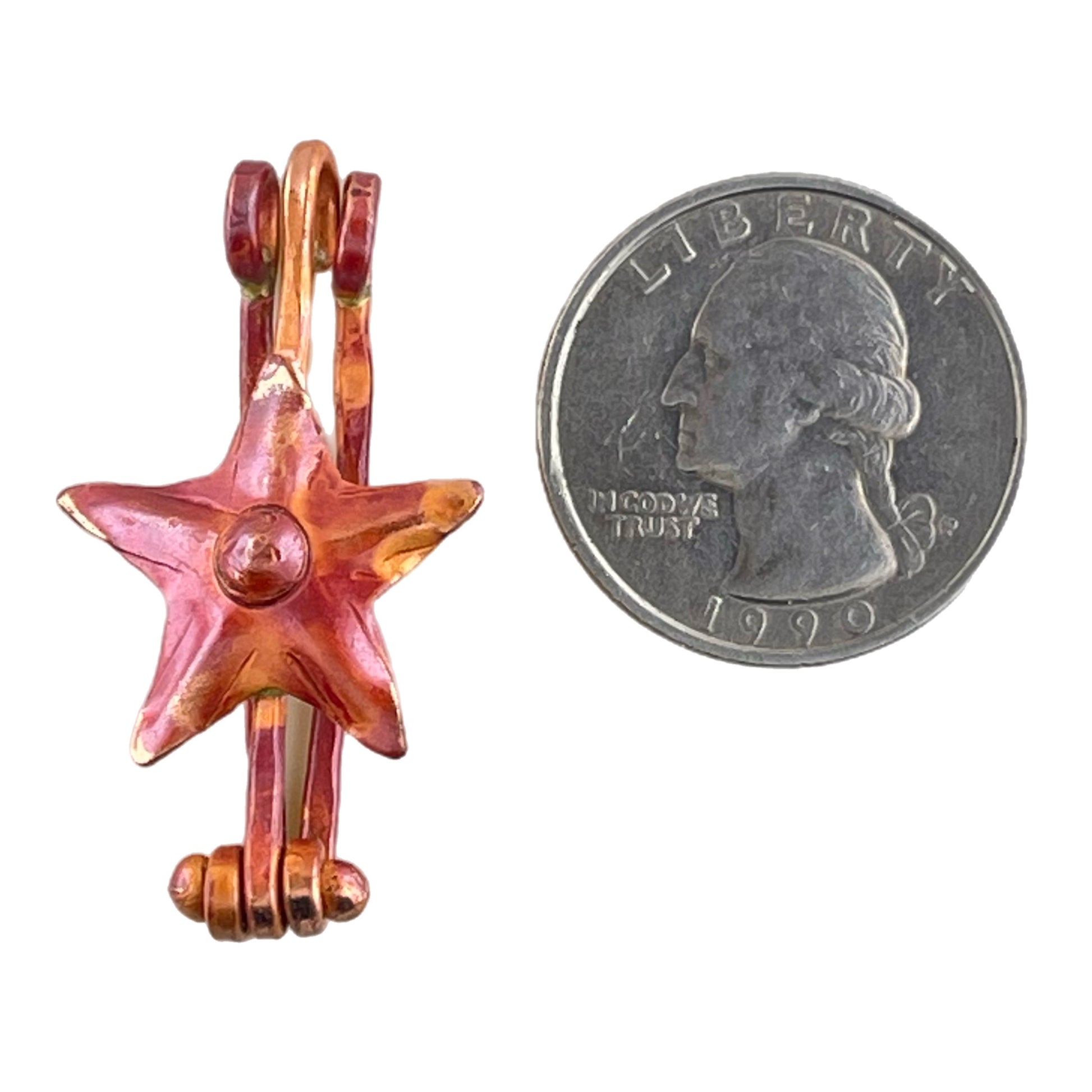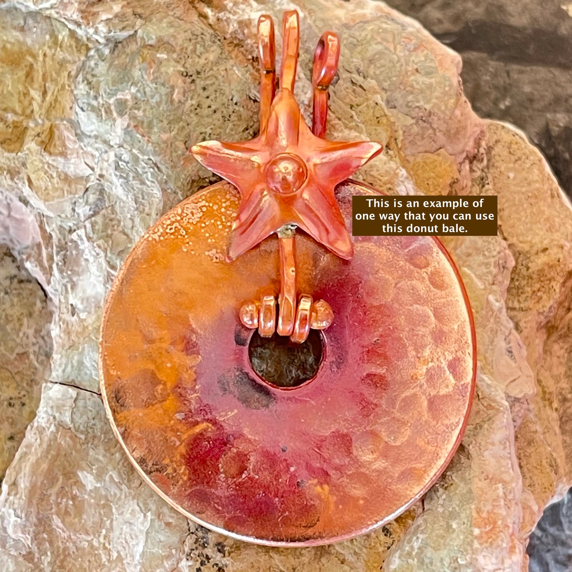 Designed to complement stone, glass, or carved bone donut pendants, this handcrafted copper star bail brings both beauty and ease to your jewelry designs. The hinge mechanism allows you to loop it smoothly through the center of your donut, making it easy to string onto chain or cord. Created with the repoussé technique and finished in a rich red-orange patina, it’s a functional accent that adds warmth, character, and a bit of celestial flair to any focal piece.