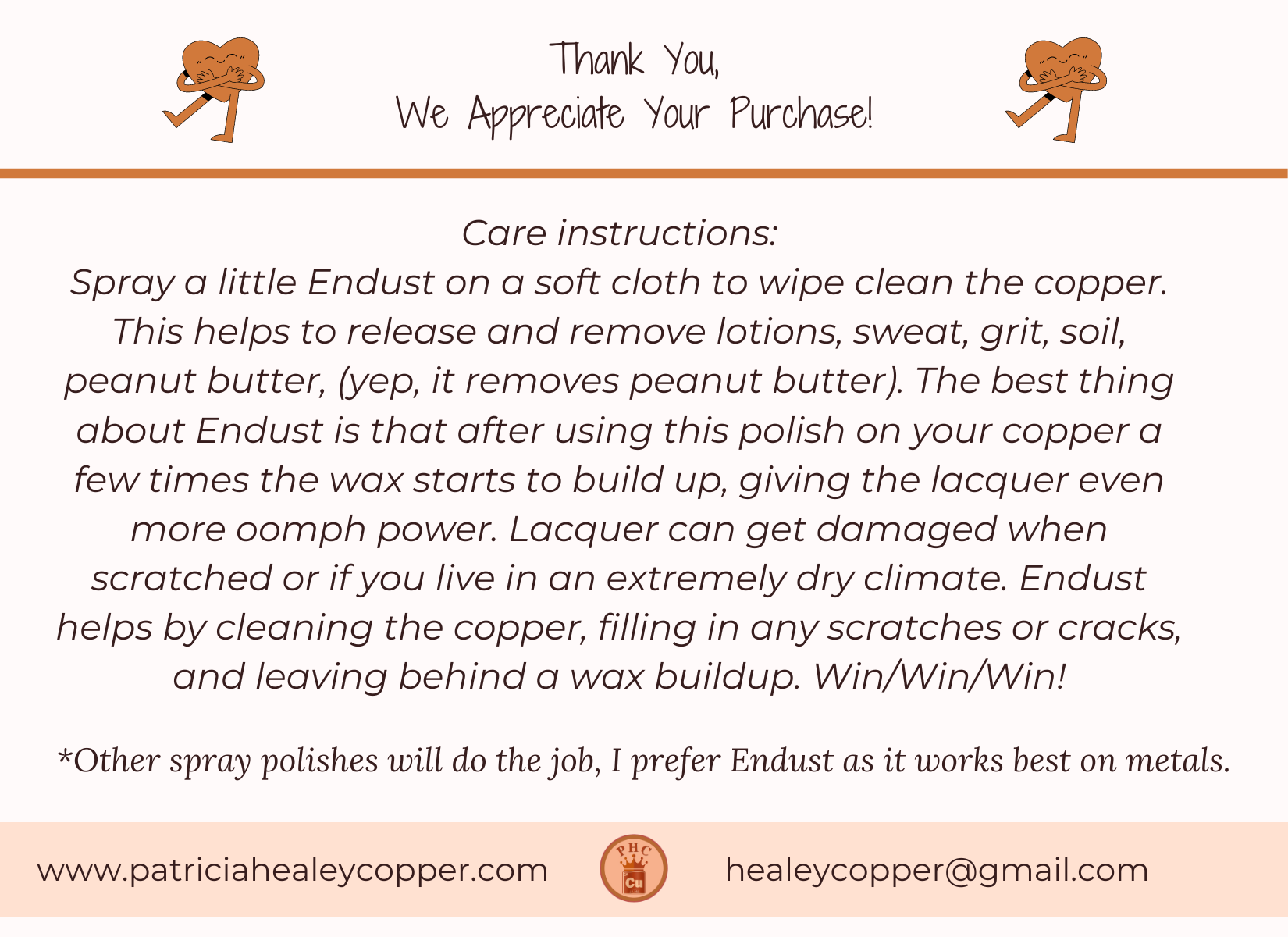 Endust is wax-free and silicone-free, with a touch of mineral oil that dissolves smudges and leaves a subtle, clean sheen. This helps preserve the lacquer’s clarity so the copper underneath stays vibrant and beautiful.