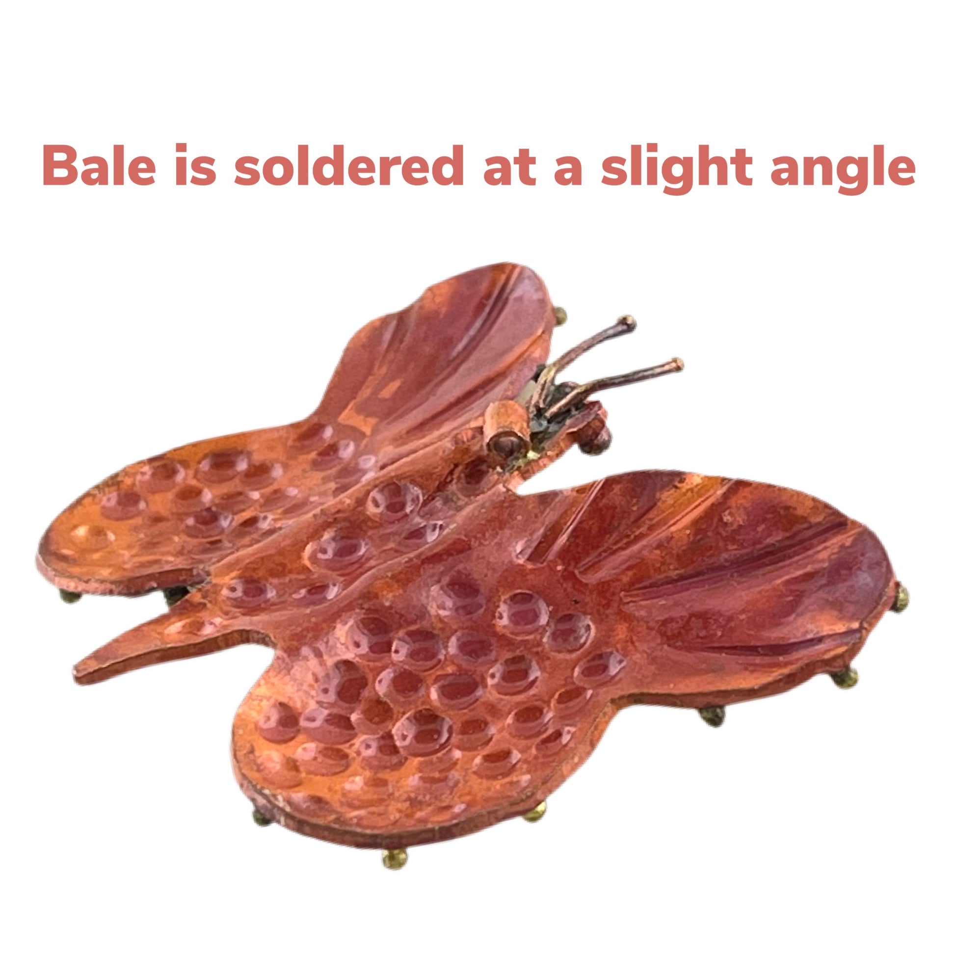 This handcrafted copper butterfly pendant adds a graceful touch to any necklace design. An original by Patricia Healey, it features a bail soldered at a slight angle, giving the piece a sense of natural movement rather than a static, upright hang. Small brass accents and hand-stamped textures bring life and depth to the wings.