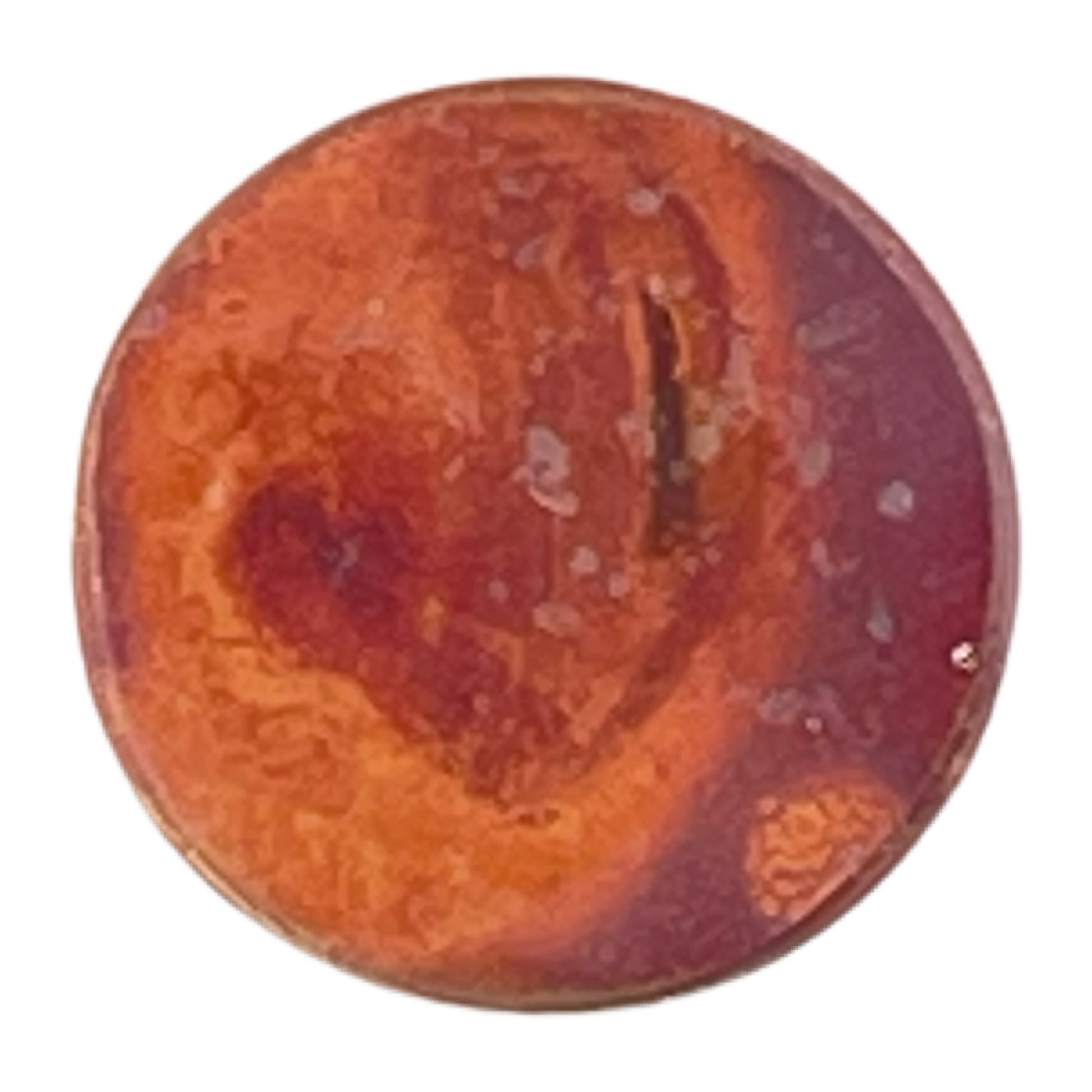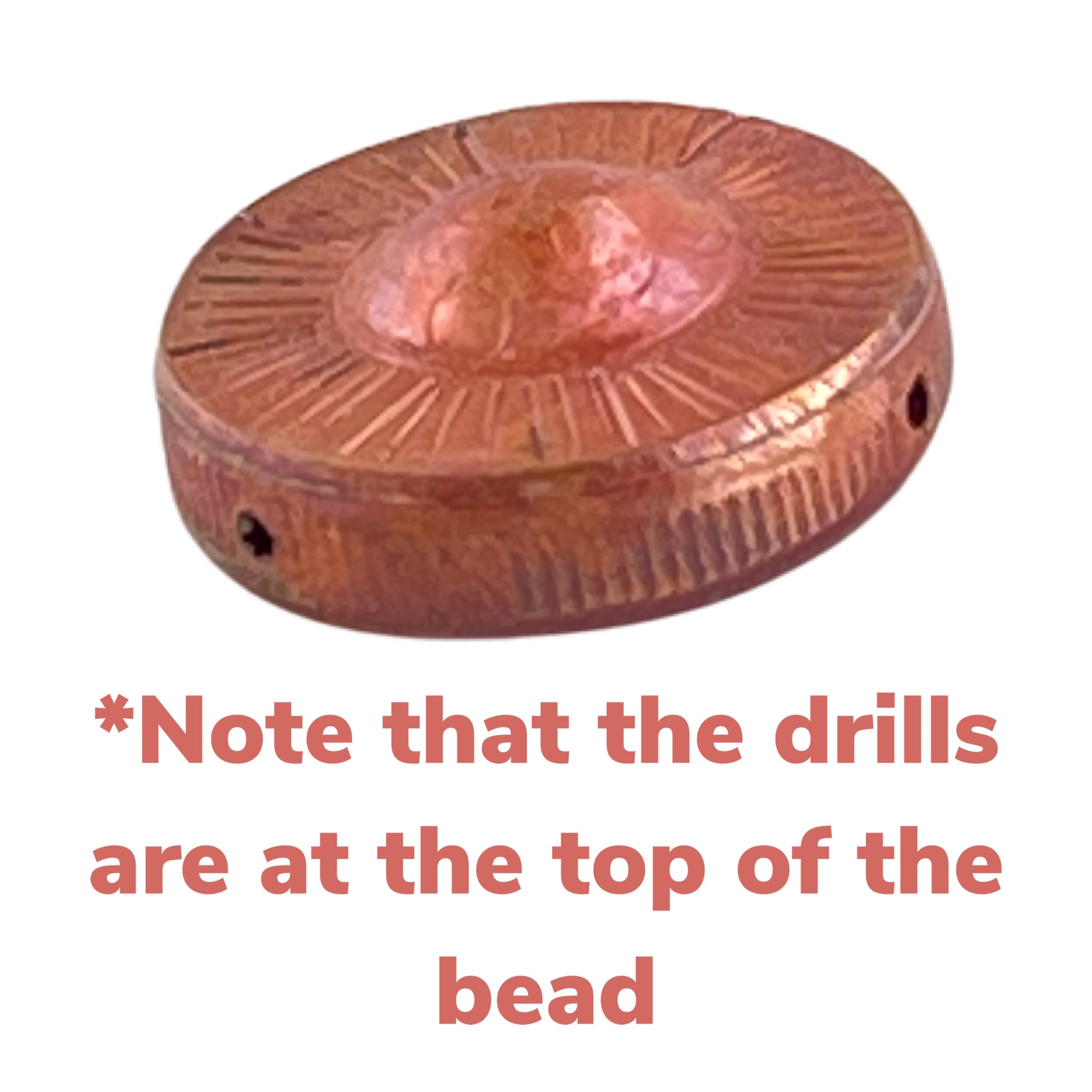 Add rich texture and dimension to your designs with this slightly domed copper bead, handcrafted by Patricia Healey. Formed using the repoussé technique and detailed with hand stamping, it features a warm red-orange patina from torch firing, sealed for lasting color. The top-drilled orientation ensures the bead stays in place without flipping, making it especially useful in necklace designs. Ideal as an accent to floral pendants or as a standalone element in earrings or mixed-media work.