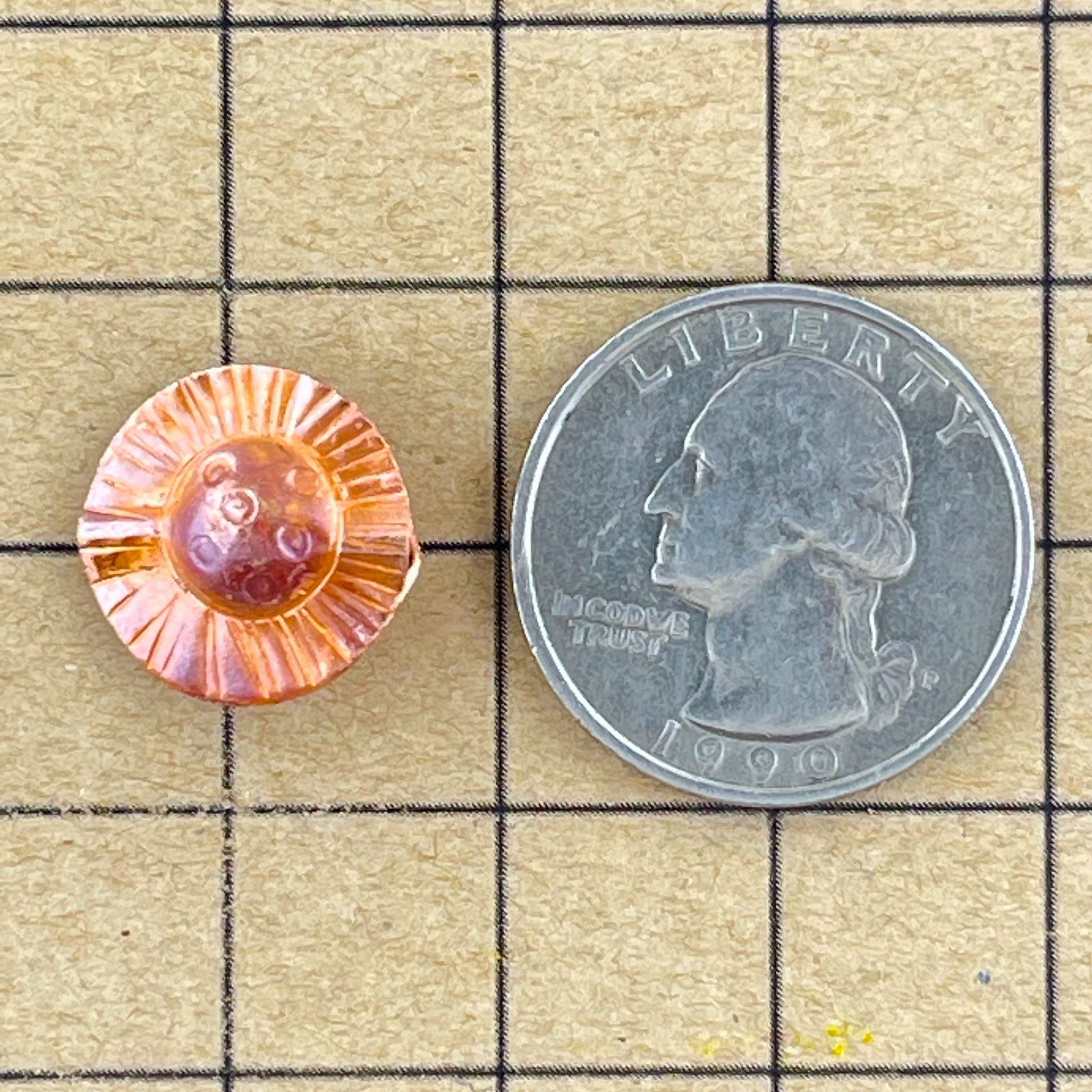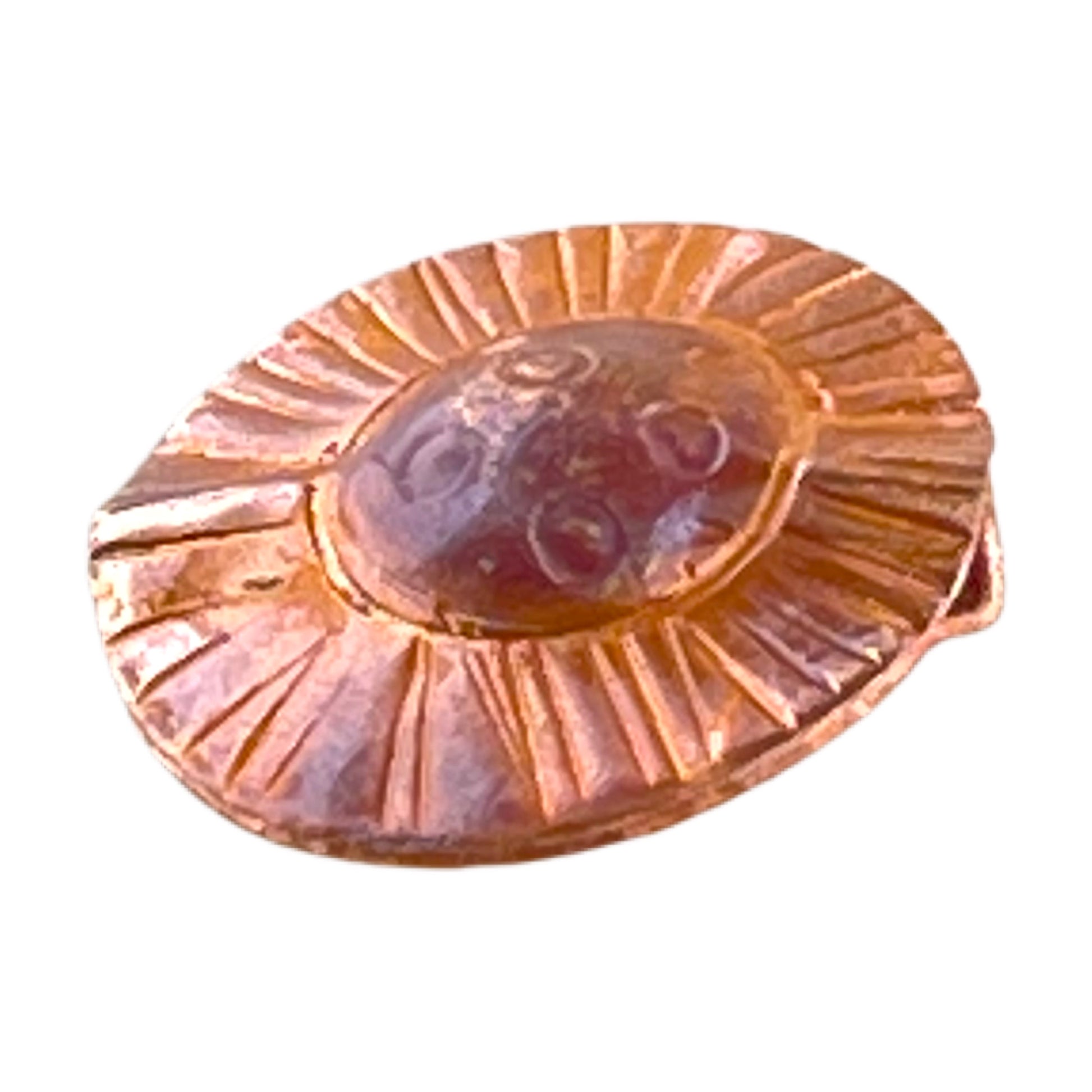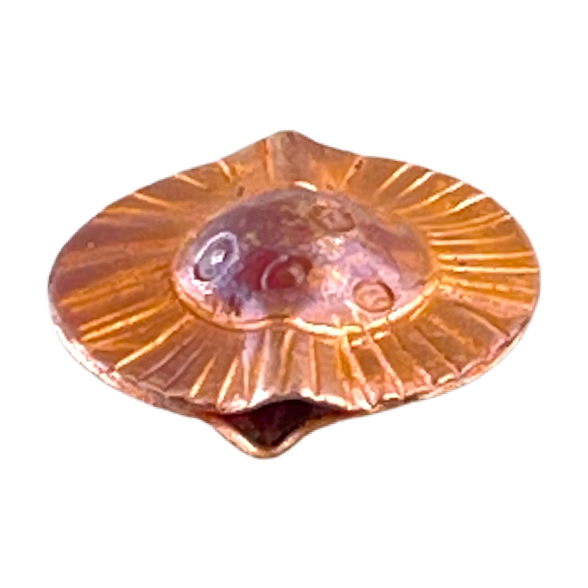With its flower-like pattern on both sides of the bead, this copper circle bead brings warm detail and texture to your designs. Created using the repoussé technique, the metal is shaped from behind, giving it depth and form. Flame-finished to reveal hues of red and orange, then sealed for durability, this bead blends beauty and craftsmanship in equal measure.