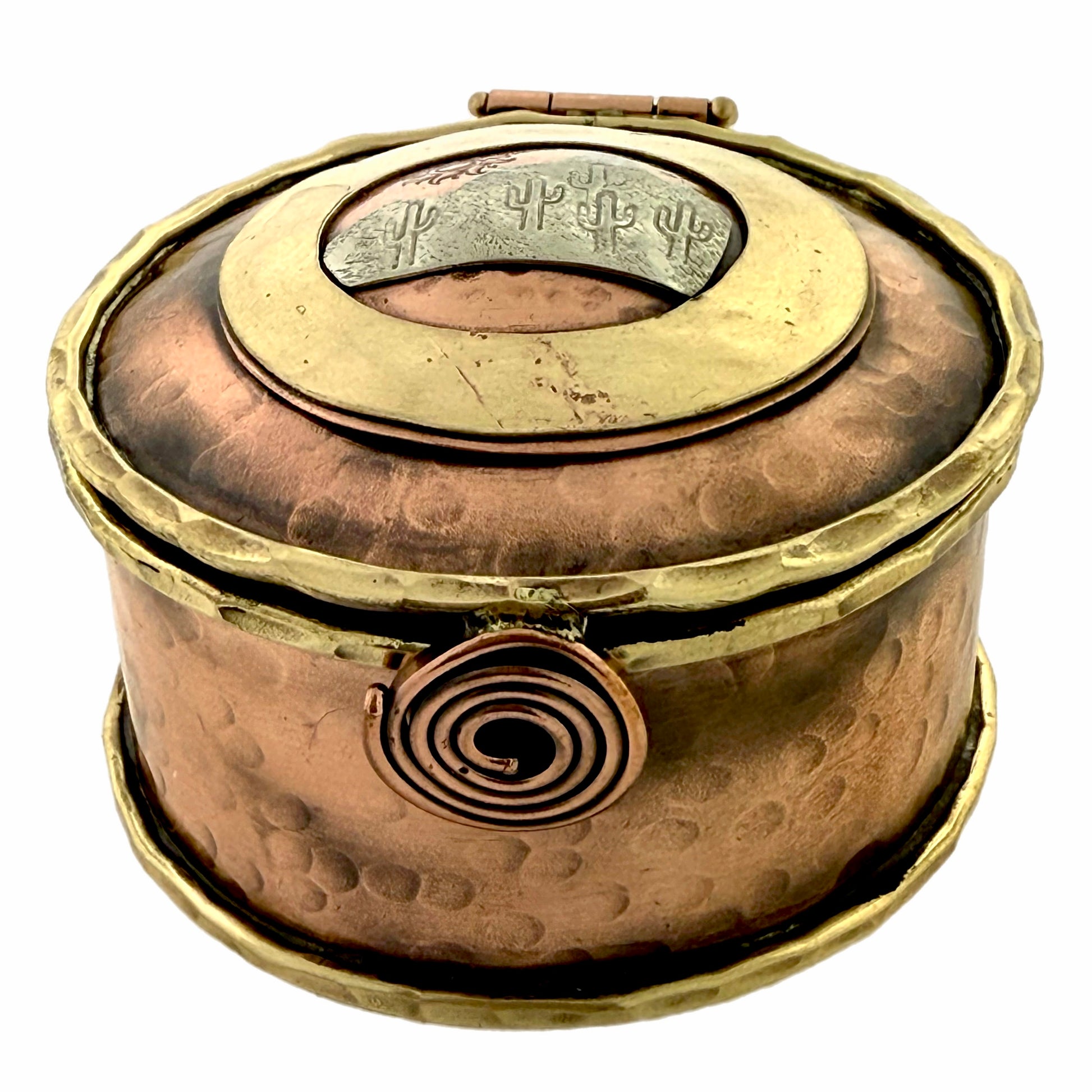 The desert comes alive on this handcrafted keepsake box, where hammered copper, golden brass, and cool German silver create a striking mountain scene. A radiant sun shines above the range, while tall saguaro cactus, giants of the Sonoran Desert, stand rooted in the foreground.