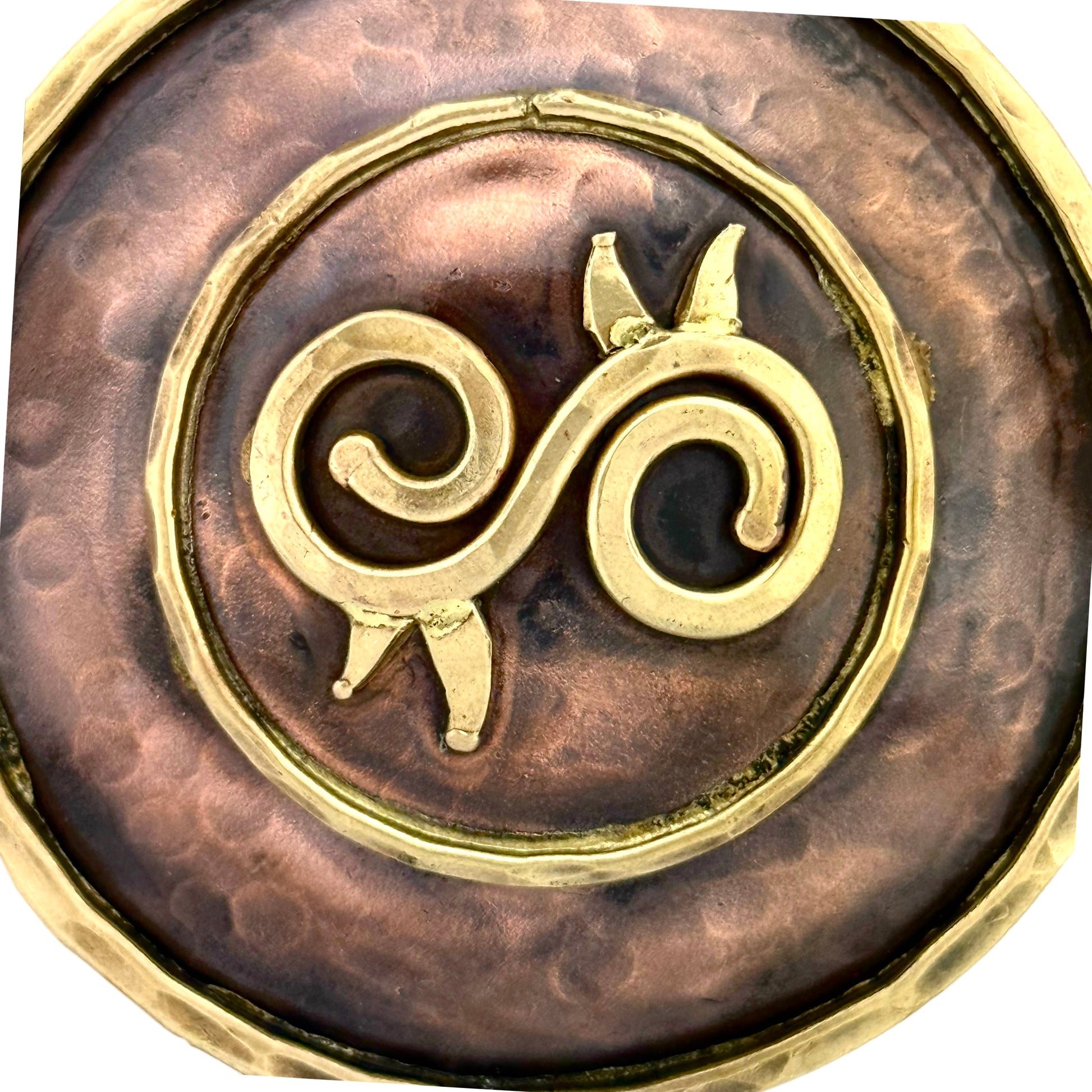 The ‘Ahoden’ is a traditional West African symbol from the Akan people of Ghana, representing strength, courage, and energy. Here, it’s expressed in copper and brass, blending cultural heritage with artisan craft.