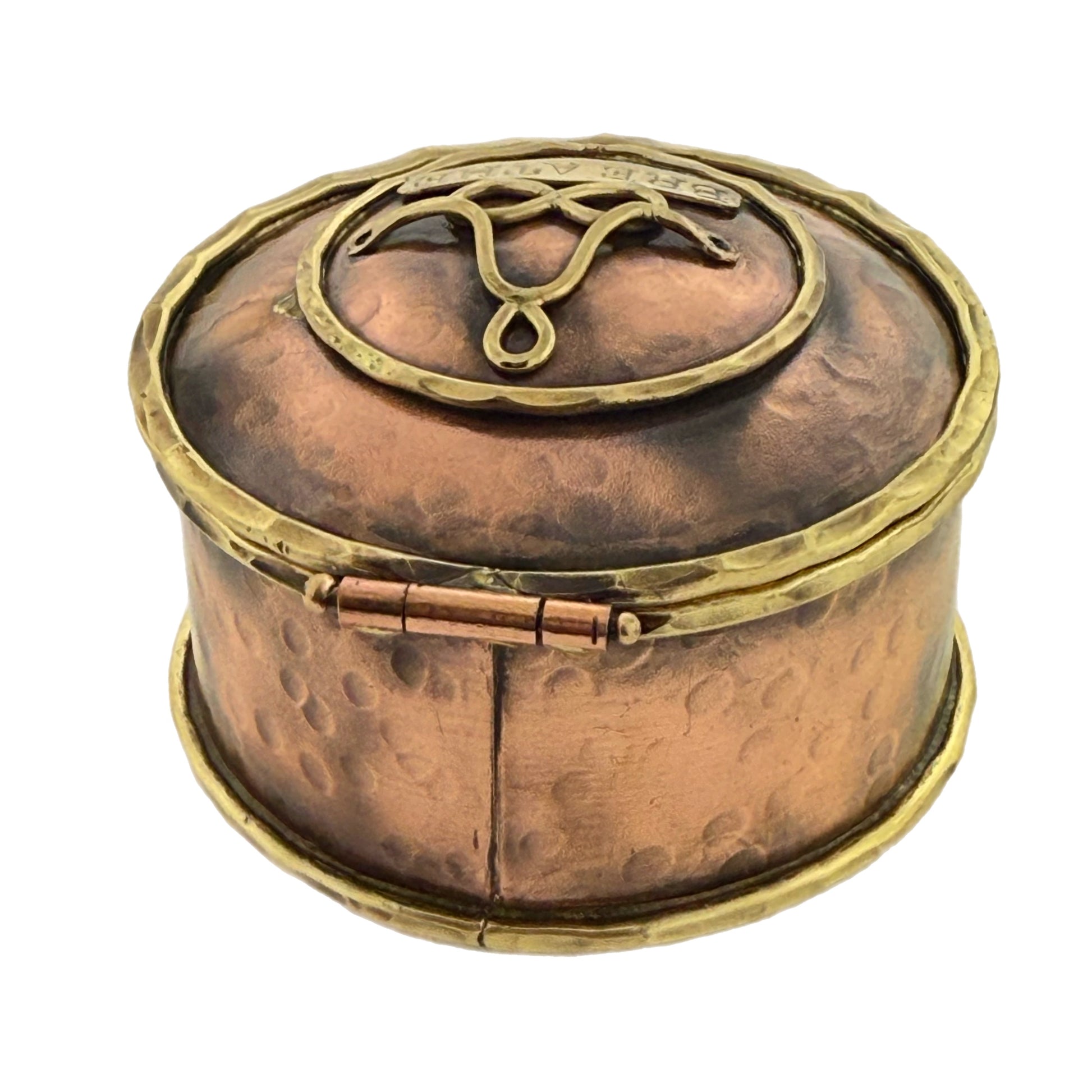 The spiraled copper latch carries its own meaning: the spiral, found in shells and galaxies, represents life’s natural flow and quiet expansion. Every hammered surface and flame-fired tone reveals warm shifts of antiqued copper against the brass, giving the piece strength as well as rustic beauty.