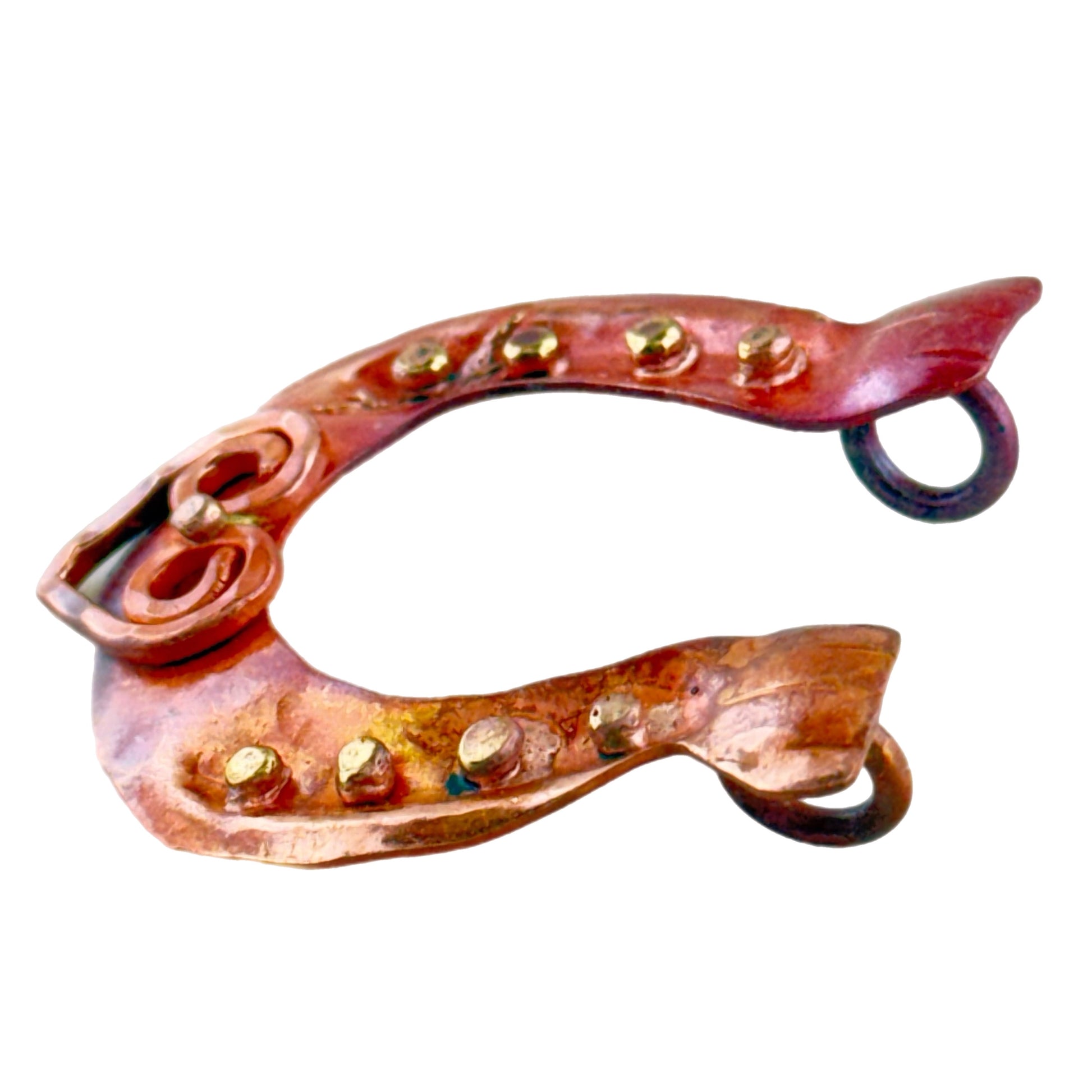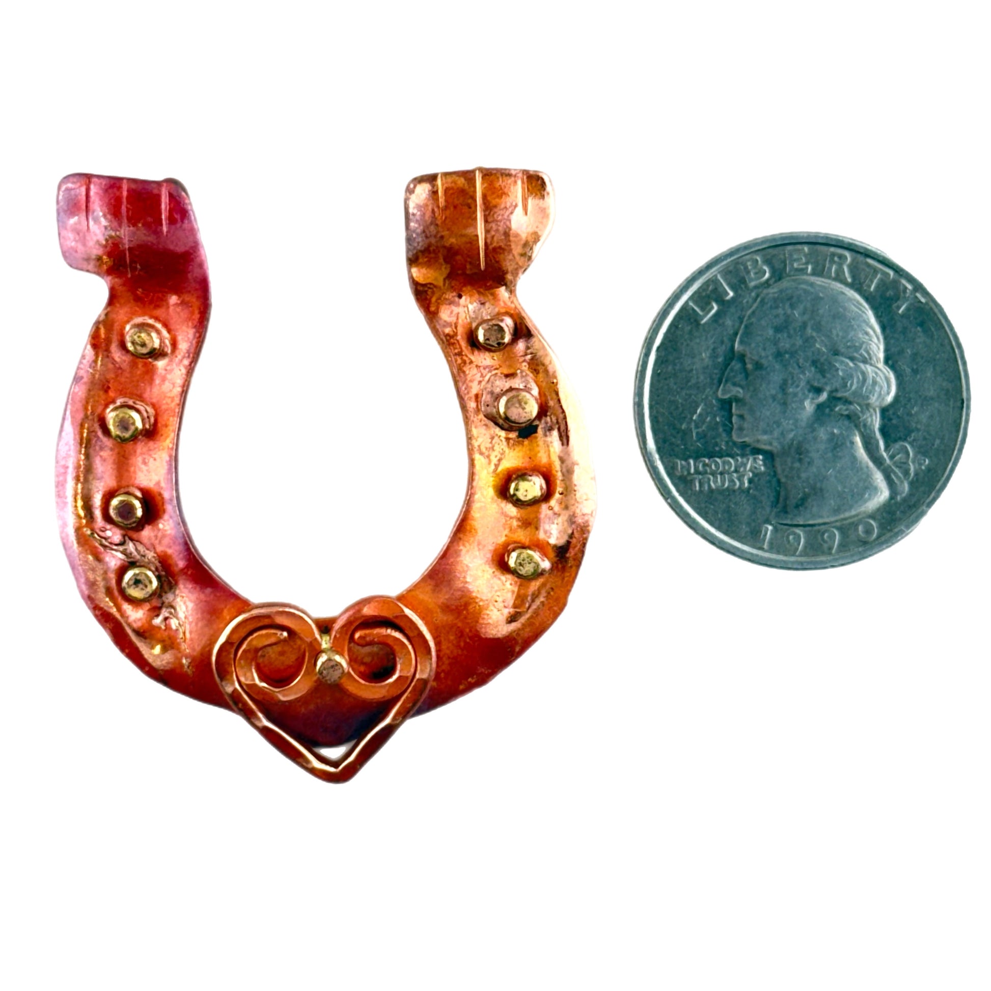 Inspired by western style and rustic charm, this handmade horseshoe pendant brings a bit of luck and a lot of character to your designs. Crafted by Patricia Healey Copper, each piece is flame-torched to create its rich copper patina and accented with textured brass detail along the curve. At the base, a handcrafted copper heart adds a soft, cowgirl spirit. The finish is sealed with lacquer for long-lasting color and protection, making this a durable and expressive centerpiece for your jewelry collection.
