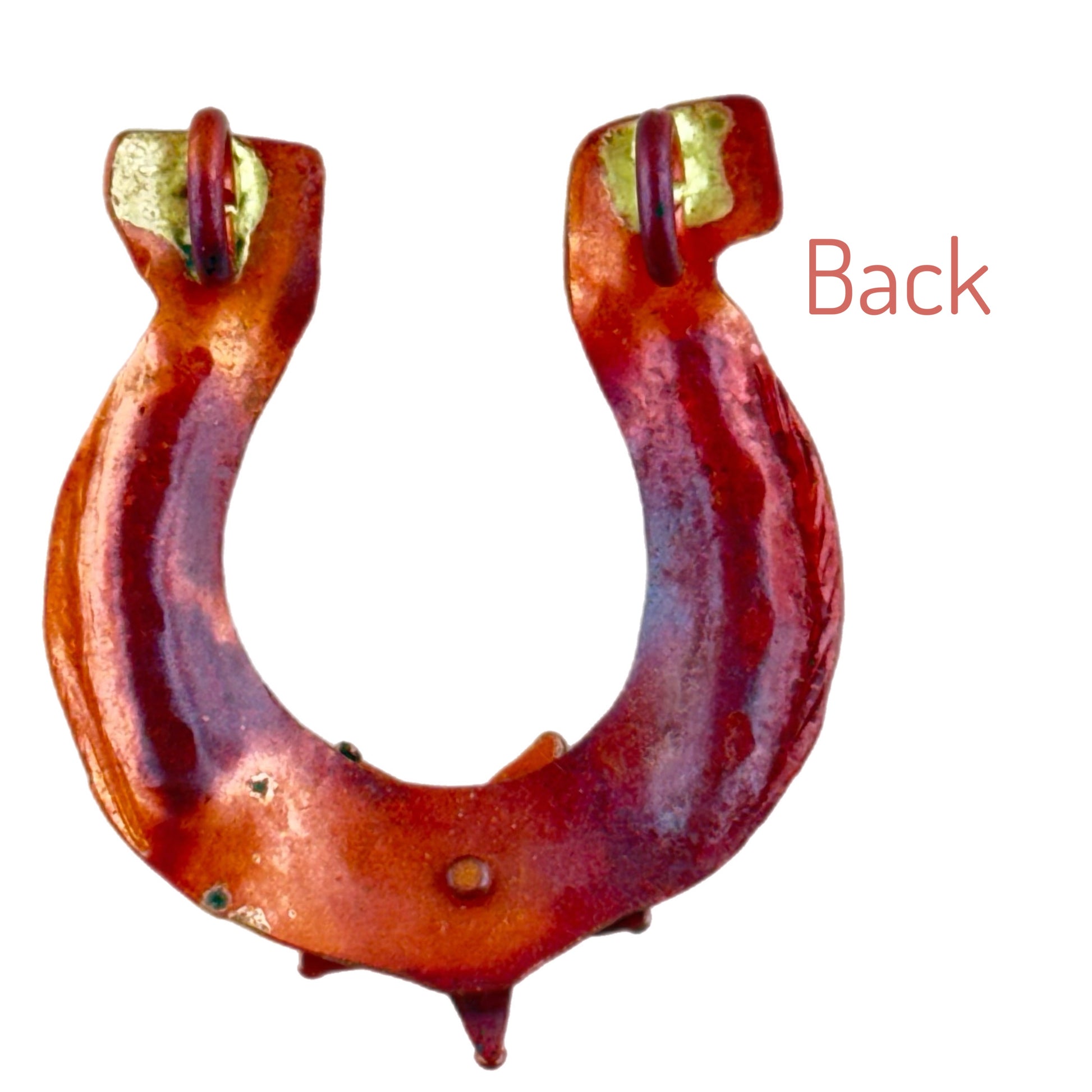 Said to invite protection and good fortune, the horseshoe is a time-honored symbol of luck. This handcrafted pendant by Patricia Healey features a bold copper horseshoe with a small star riveted at the bottom—an added nod to hope, direction, and resilience. Formed with traditional repoussé and hand-stamping techniques, each piece is flame-torched to bring out its warm patina and sealed for long-lasting beauty. A meaningful addition to western or rustic-inspired jewelry designs.