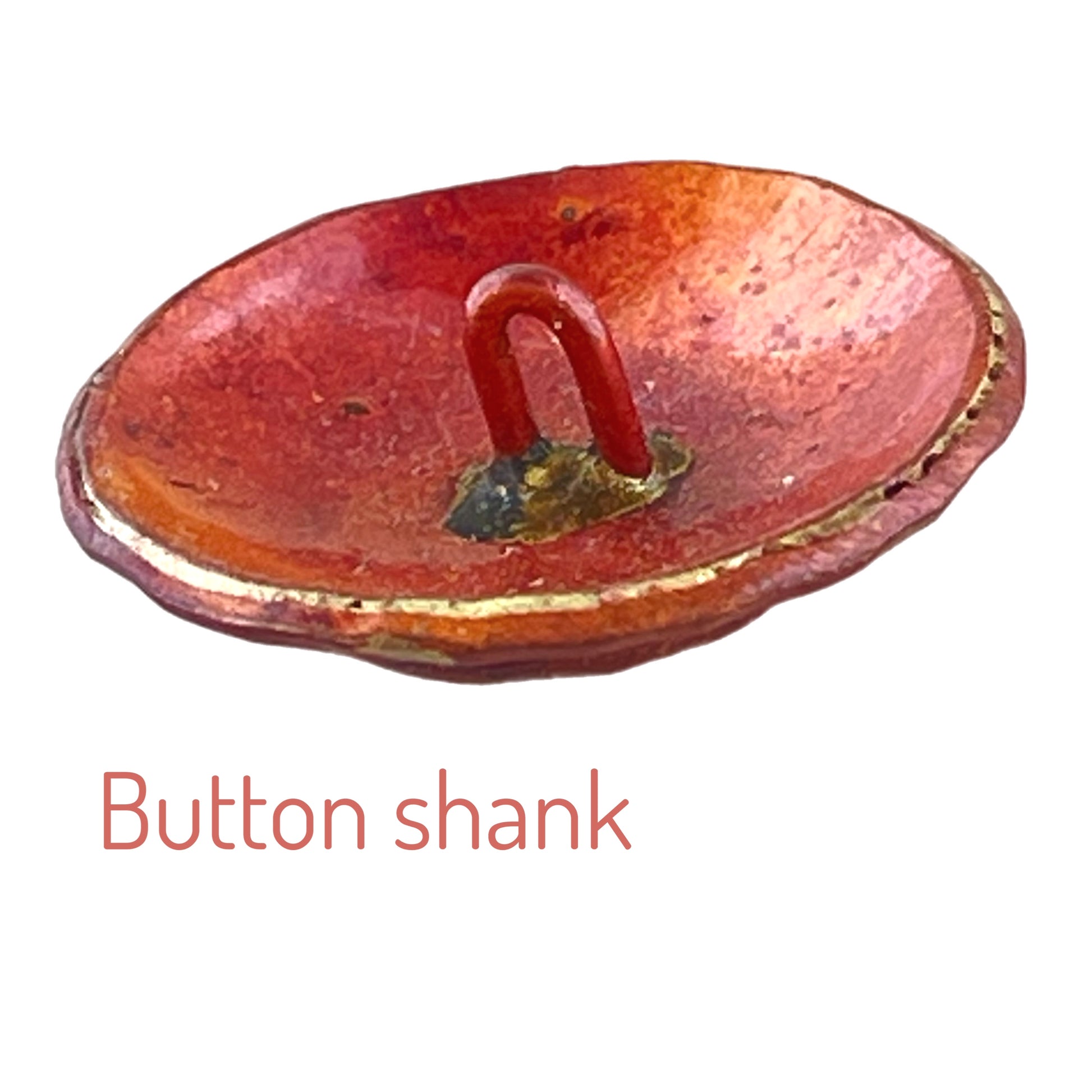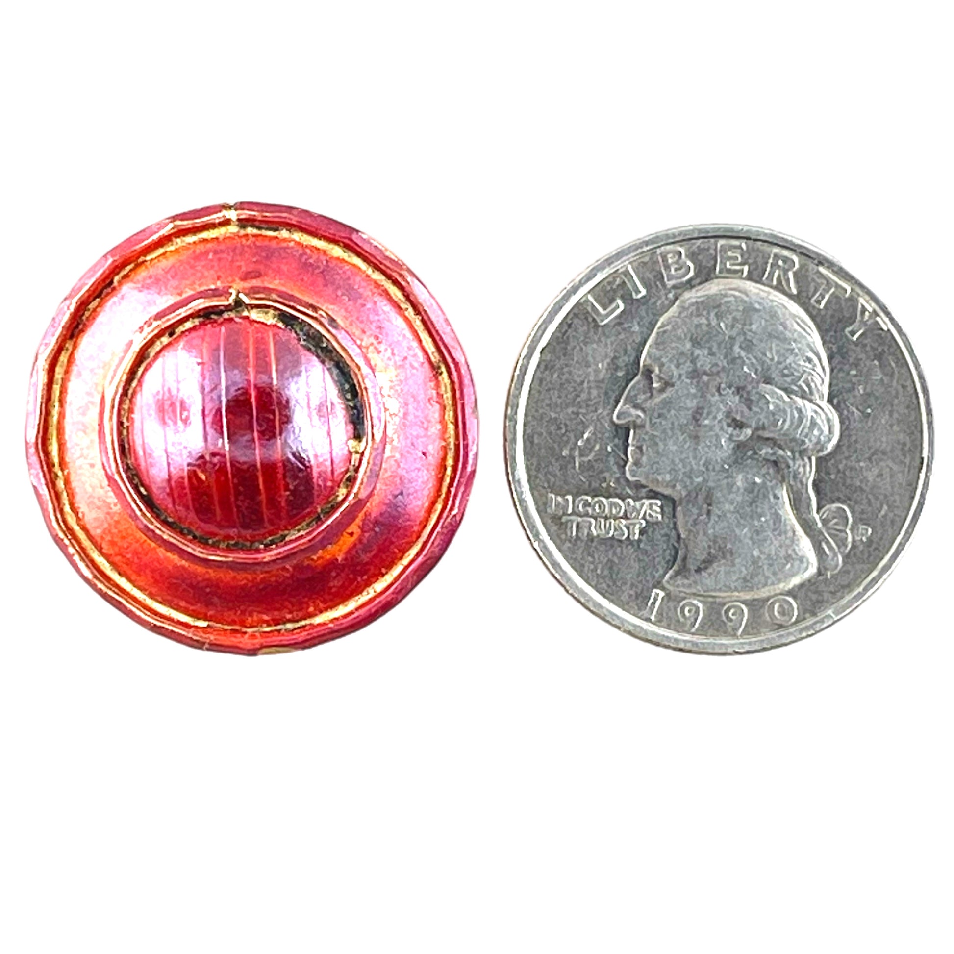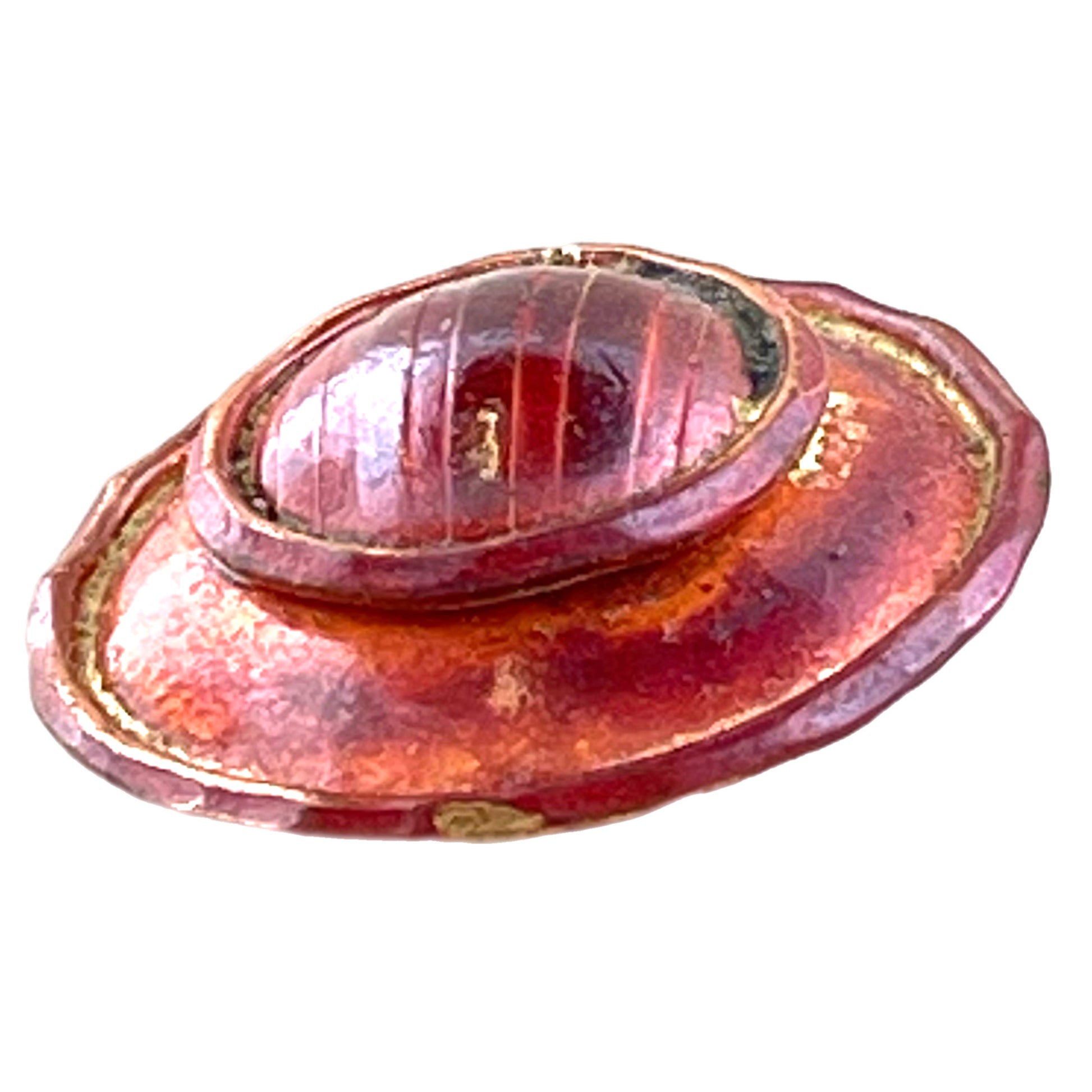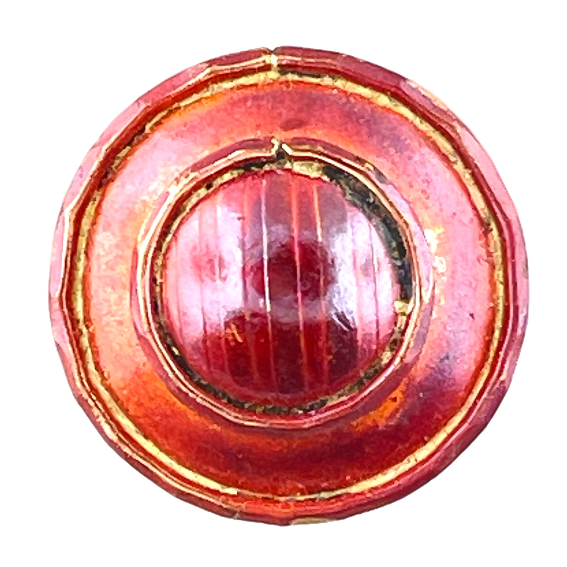This domed copper button features two stacked circles, each framed and full of hand-sculpted detail. The base layer has a bold, clean outline while the top layer is richly textured with raised lines and a rounded form. Designed by Patricia Healey, finished in red and mottled patina, and sealed with lacquer for lasting color. Complete with a sturdy shank, it’s a standout piece for jewelry, garments, or layered mixed-media work.