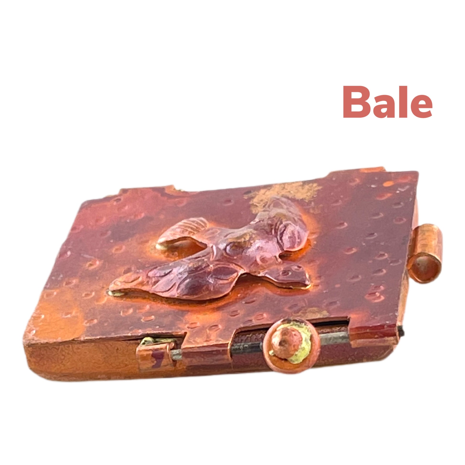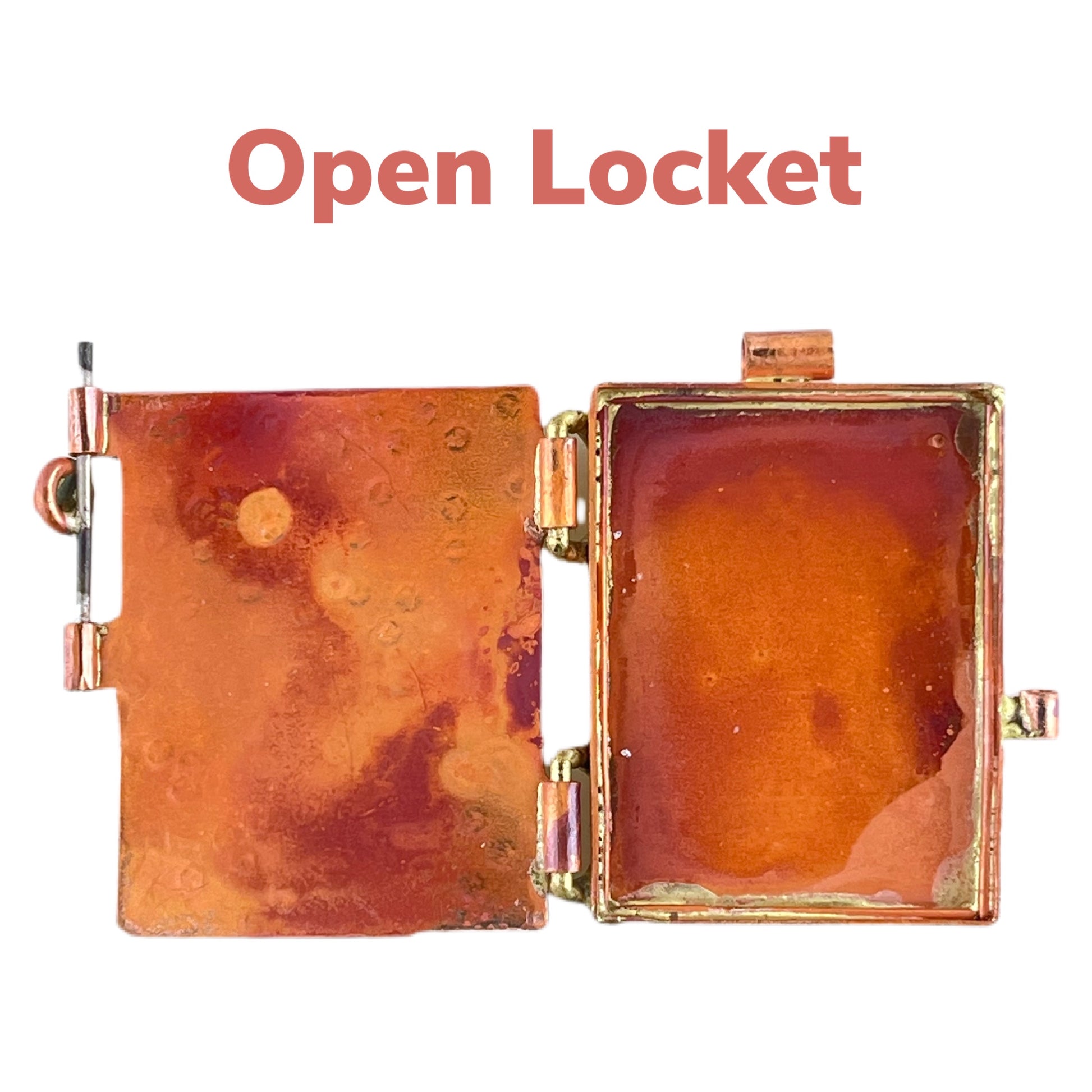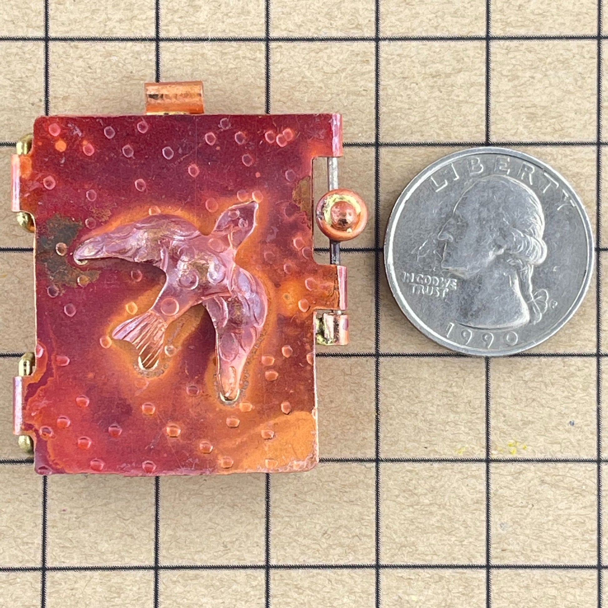 A peaceful dove symbolizes hope and resilience in this handcrafted copper and brass locket by Patricia Healey. Created using repoussé technique, the dove is shaped from behind to form a raised relief that brings it softly to life. The swinging door opens to reveal a small space for a photo, keepsake, or resin art, secured by a decorative locking clasp. Warm reds and soft oranges develop through torch-firing and are sealed with lacquer to protect the rich, rustic finish. An artisan-crafted piece, perfect for necklaces and cherished by those drawn to jewelry with spirit and soul.