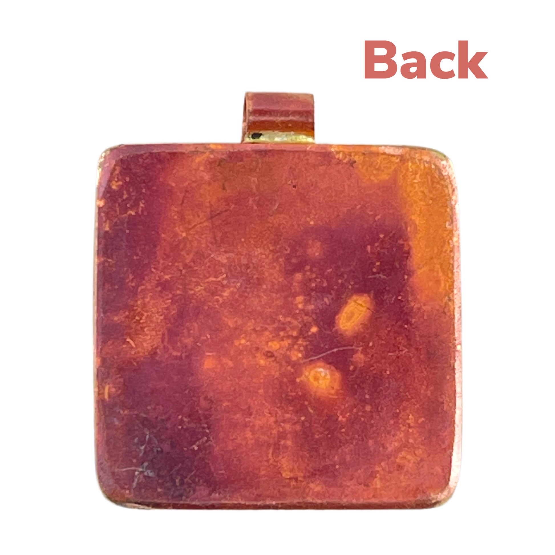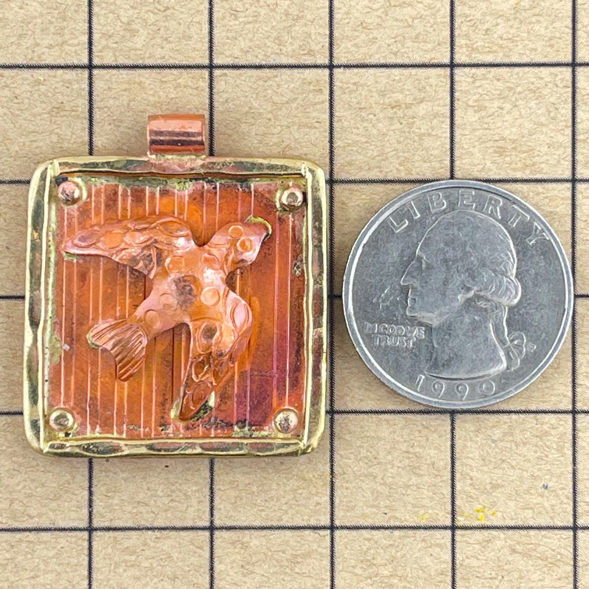 Often seen as a messenger of hope, the dove brings a sense of optimism and renewal. This original pendant, designed by Patricia Healey, is crafted in pure copper with brass accents. Highly detailed with stamping and brass embellishments, it offers plenty of texture and interest. The bird’s form is achieved using the repoussé technique, lifting the metal from the reverse side to give the dove a lifelike, flying appearance. The golden brass frame adds contrast and strength, while the surface reveals rich reds and oranges from torch-firing, sealed for lasting color.