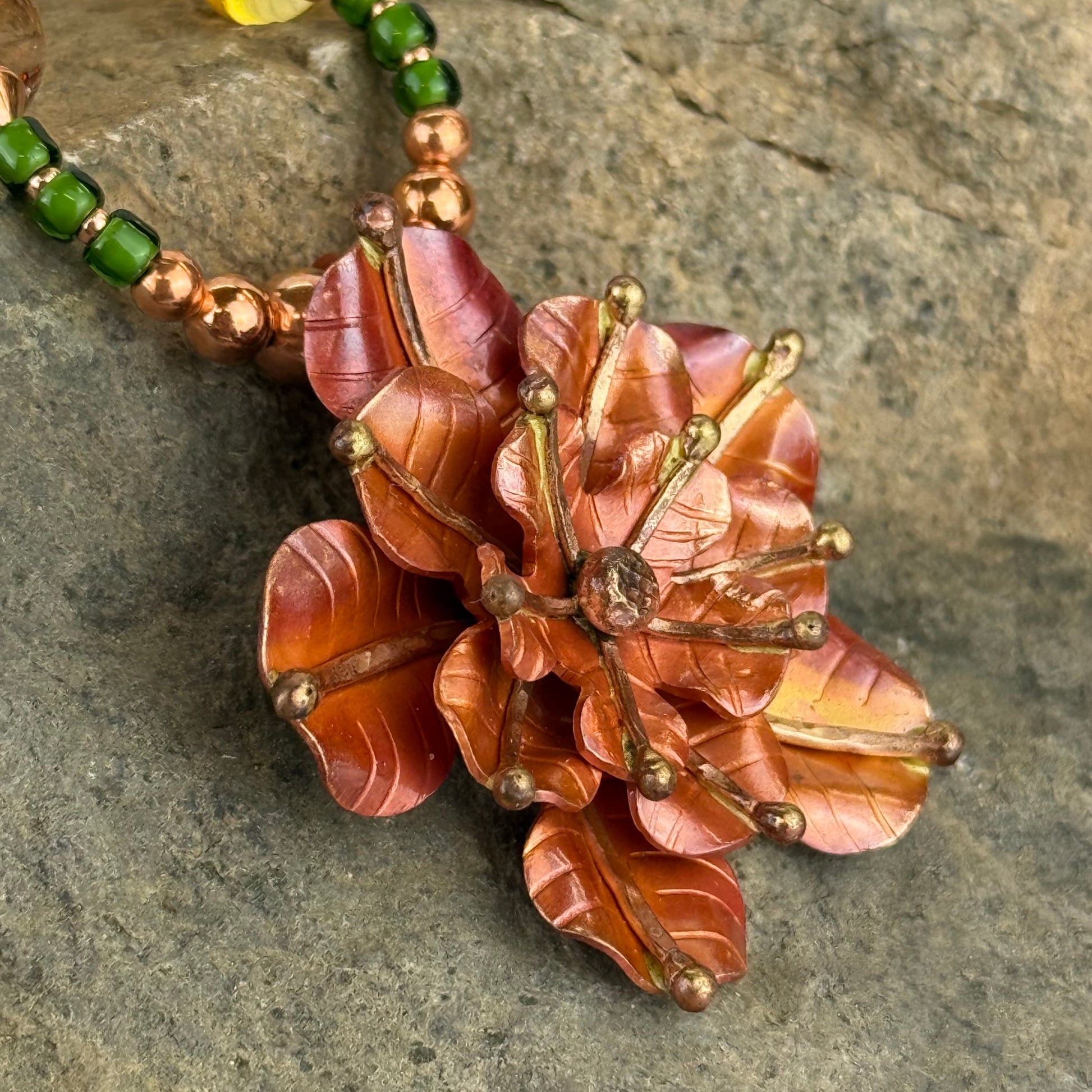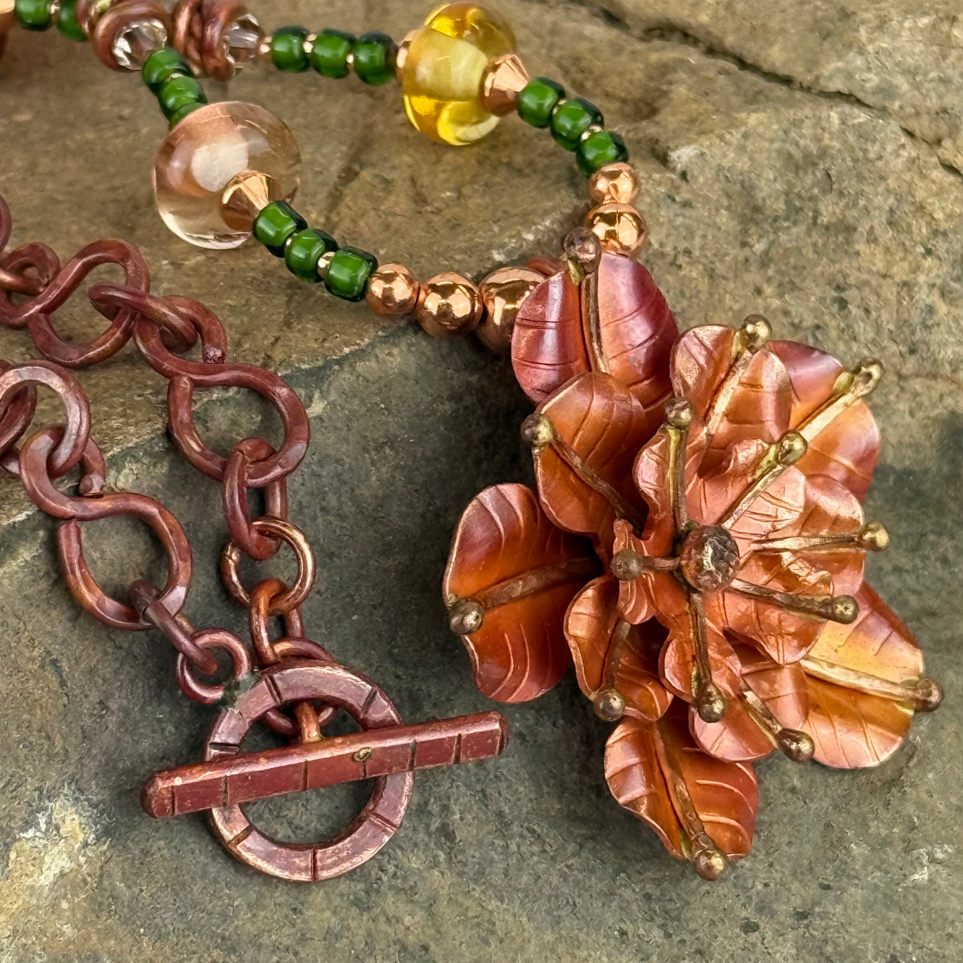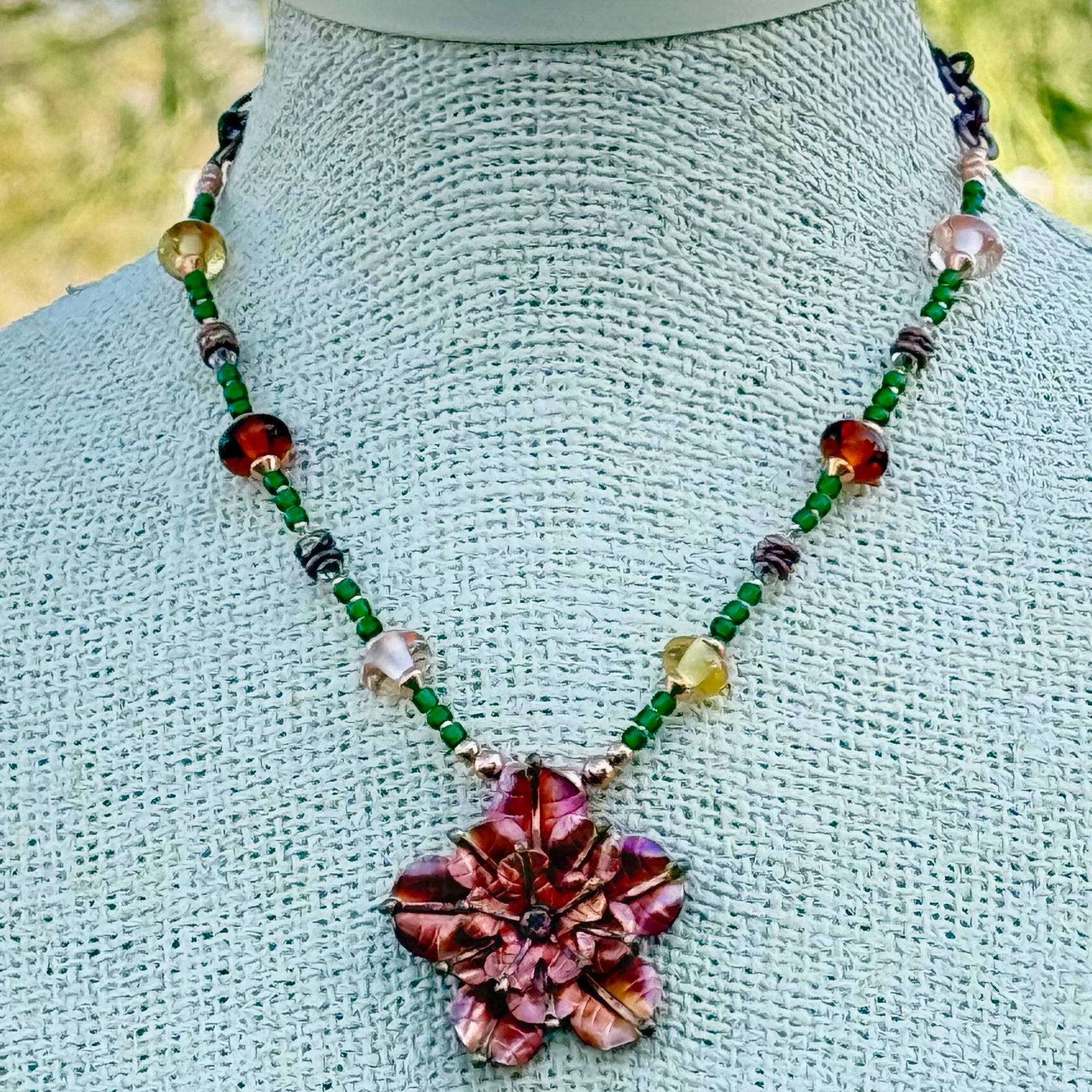 Inviting the eye with rich colors and handcrafted textures, this necklace blends artisan-crafted glass cane beads and shimmering Swarovski crystals with green dichroic Japanese seed beads. Our rustic handmade copper chain ties it all together. The Elizabeth rose pendant is a sculpted piece with three repoussé layers accented with brass. Each petal carries subtle texture and depth, brought to life by torch-fired color and sealed with lacquer to preserve its warm red-orange patina. The toggle clasp completes the design with rustic elegance.