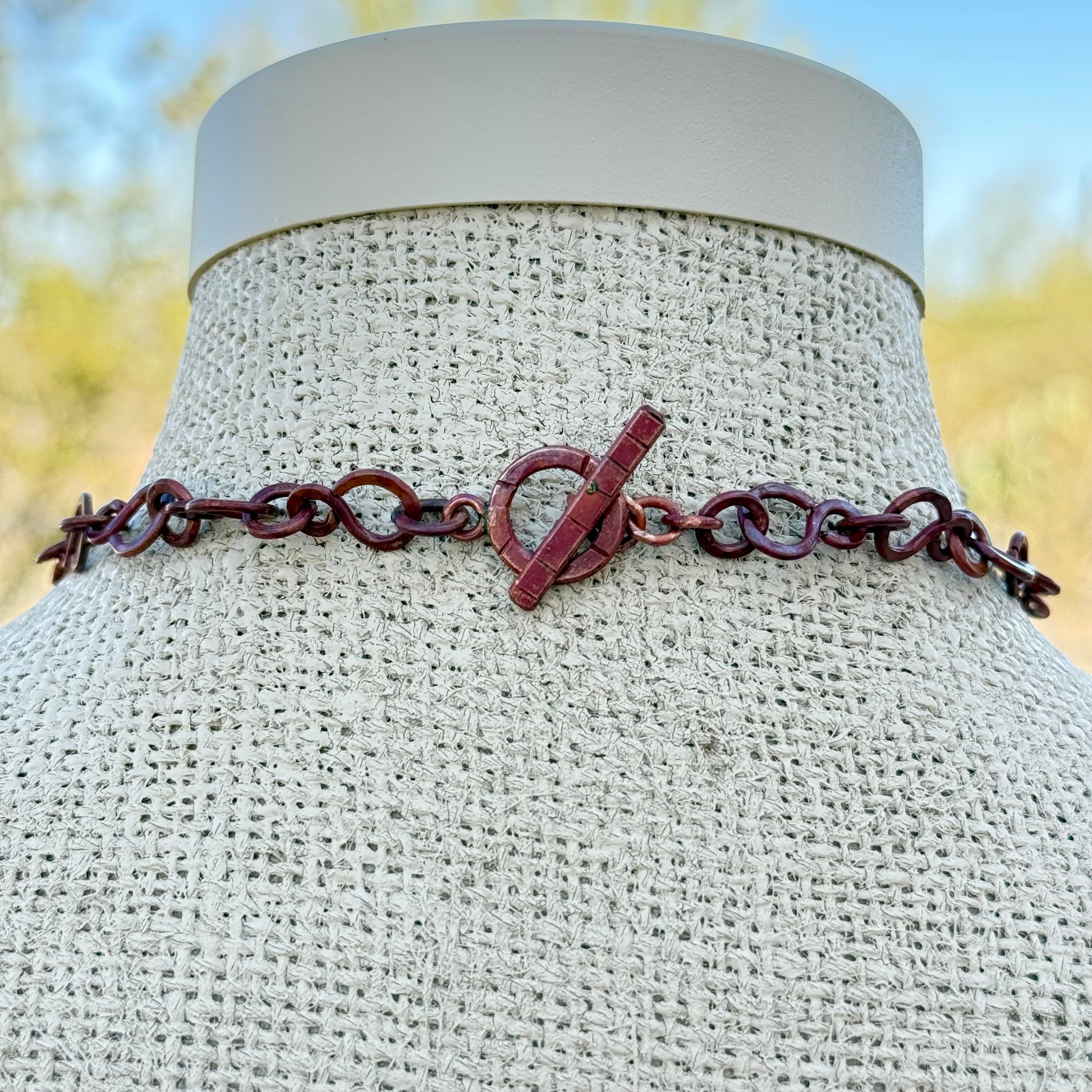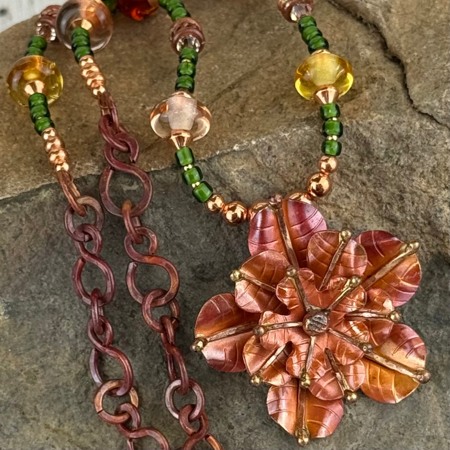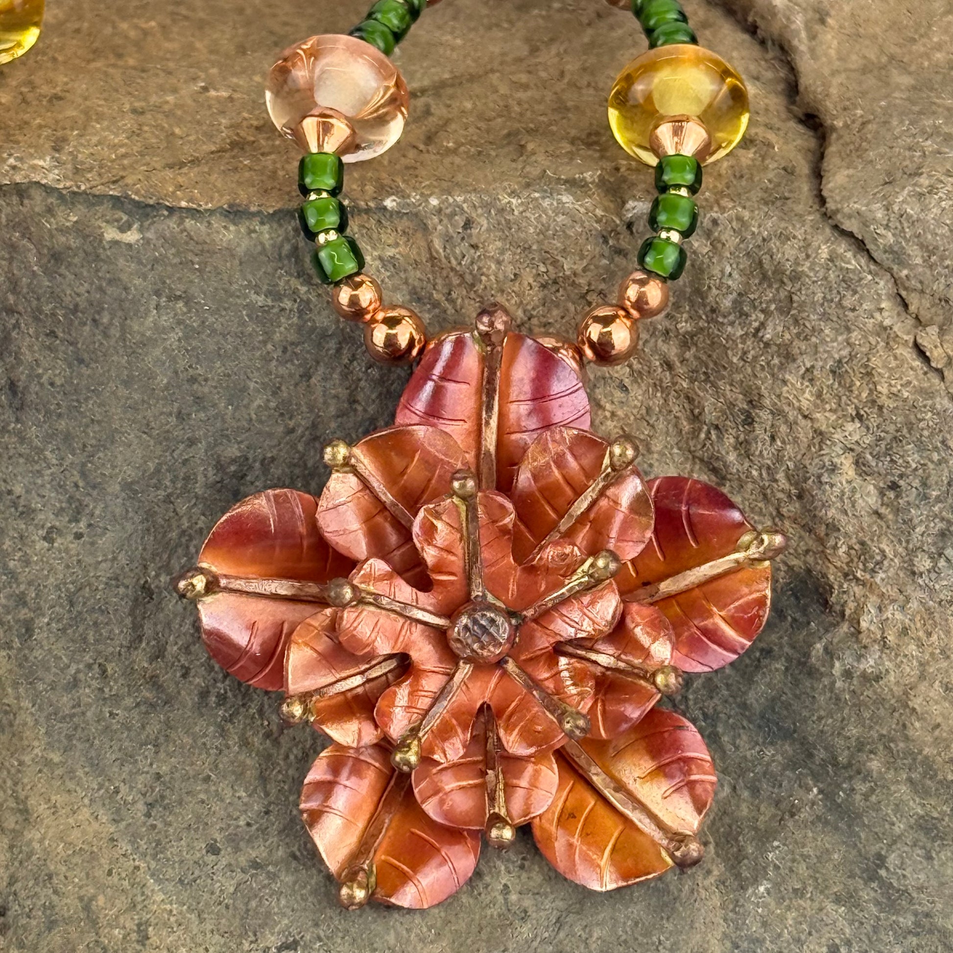 Inviting the eye with rich colors and handcrafted textures, this necklace blends artisan-crafted glass cane beads and shimmering Swarovski crystals with green dichroic Japanese seed beads. Our rustic handmade copper chain ties it all together. The Elizabeth rose pendant is a sculpted piece with three repoussé layers accented with brass. Each petal carries subtle texture and depth, brought to life by torch-fired color and sealed with lacquer to preserve its warm red-orange patina. The toggle clasp completes the design with rustic elegance.