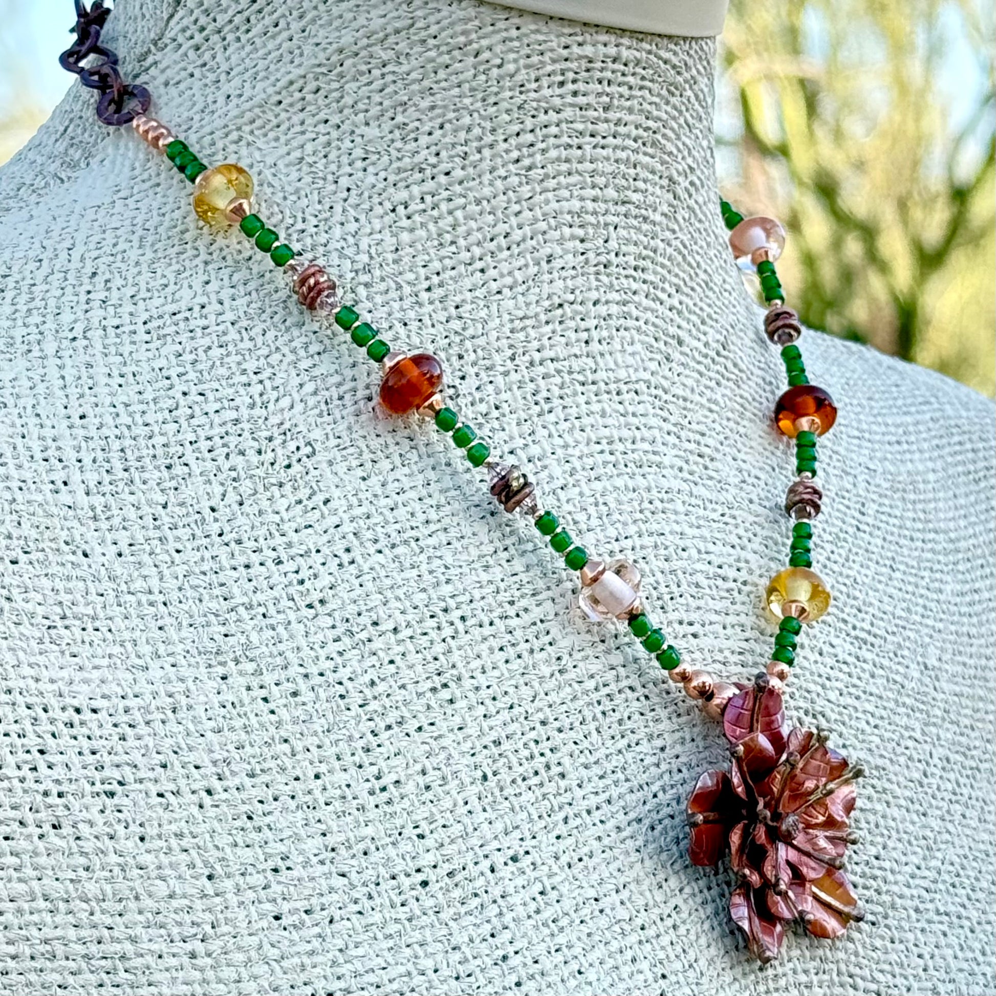 Beaded Strand Length ~ 18 1/2" • Pendant drop ~ 1 3/4" • Materials ~ Genuine Copper and Brass with Artisan Glass Beads, Japanese Dichroic Glass Seed Beads and Swarovski Crystal Beads