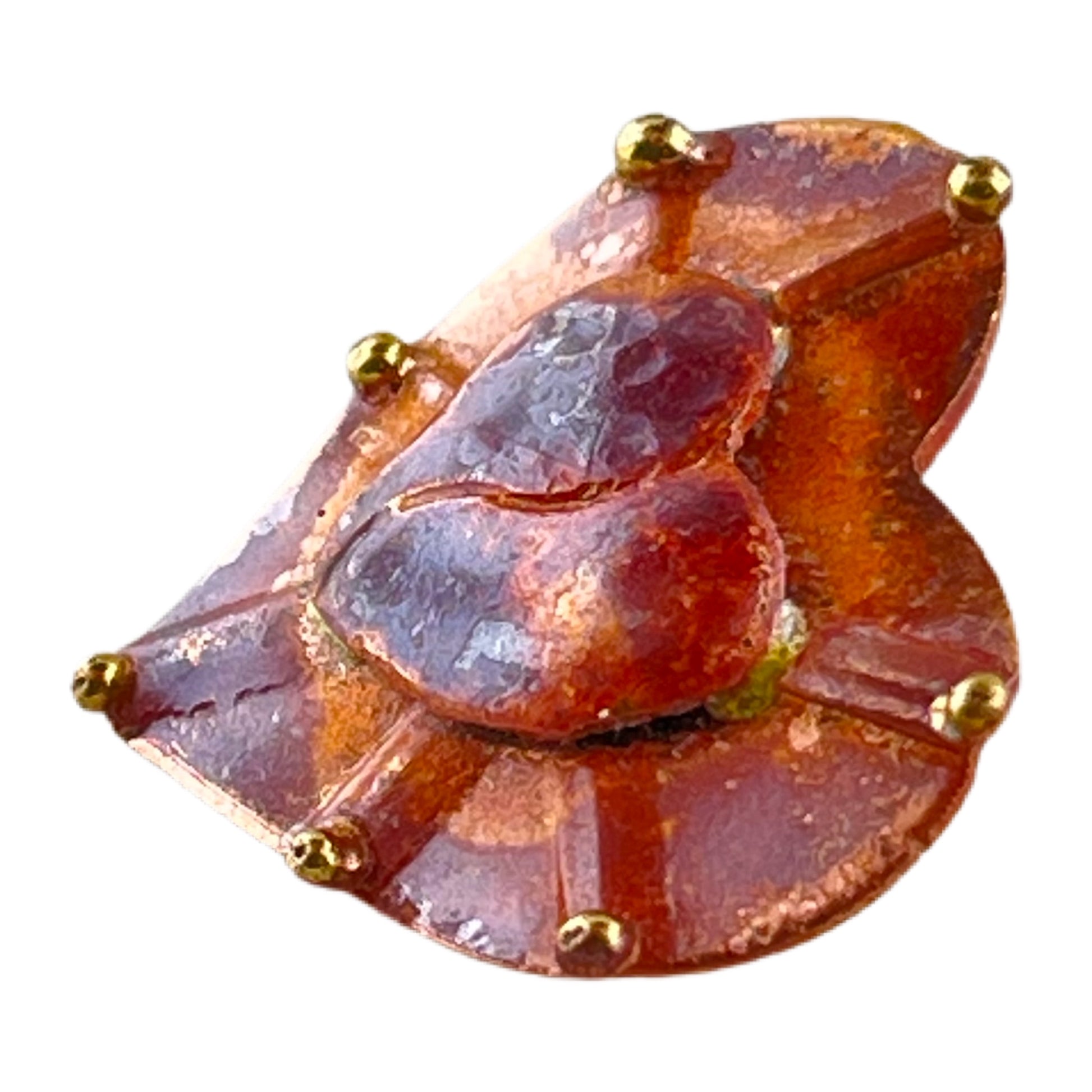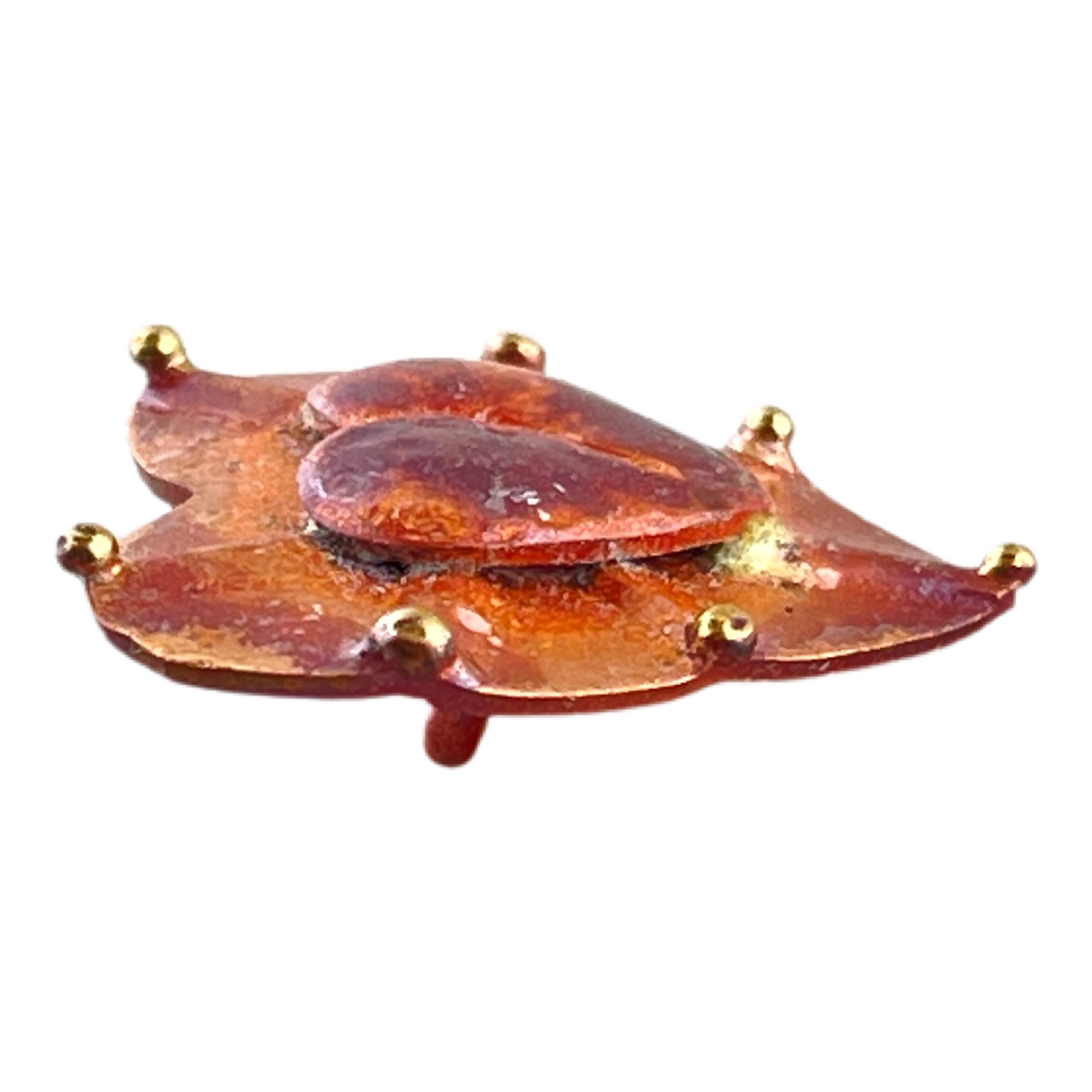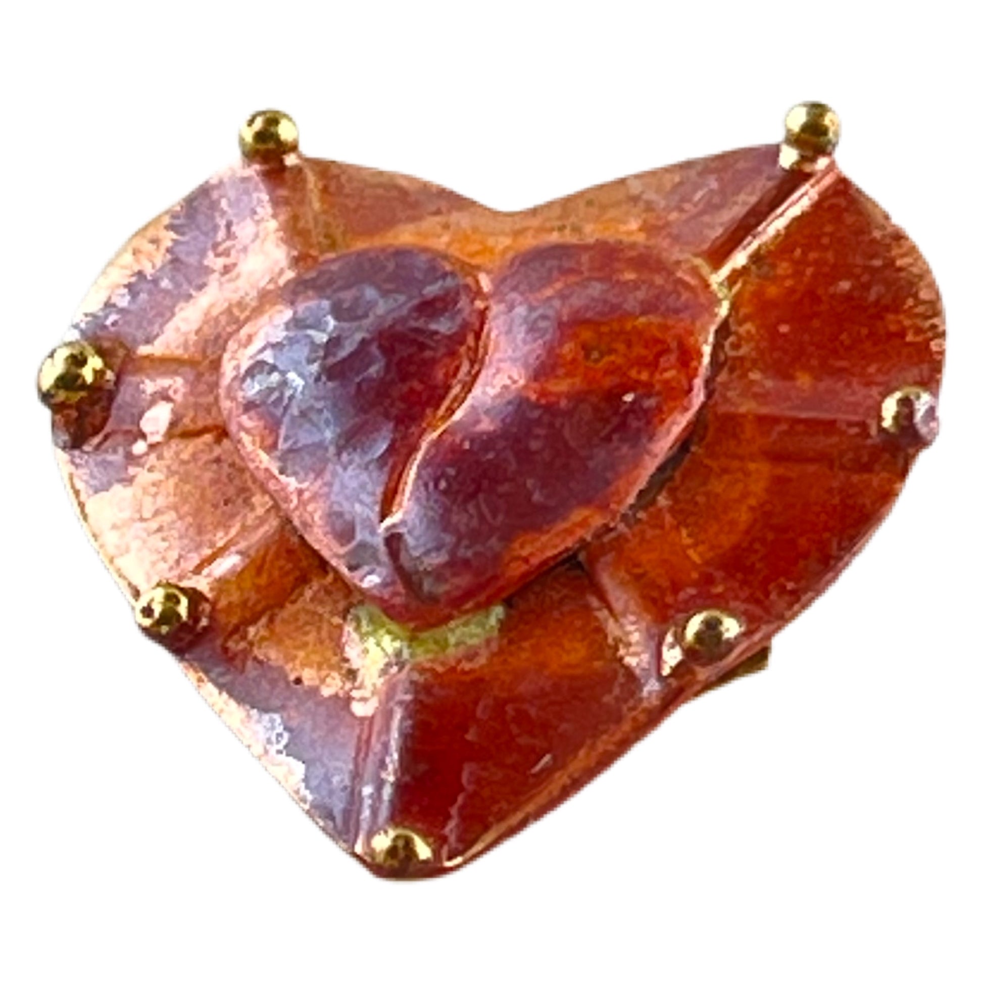 A layered heart design with warmth and radiance. The base heart is flat copper, hand-formed with delicate brass-tipped rays extending outward. Nestled atop it is a slightly domed heart, creating depth and contrast in this dimensional piece. The red torch patina brings richness to the metal, and the finish is sealed for lasting color. Completed with a sturdy copper shank for use in jewelry, garments, or mixed-media design.