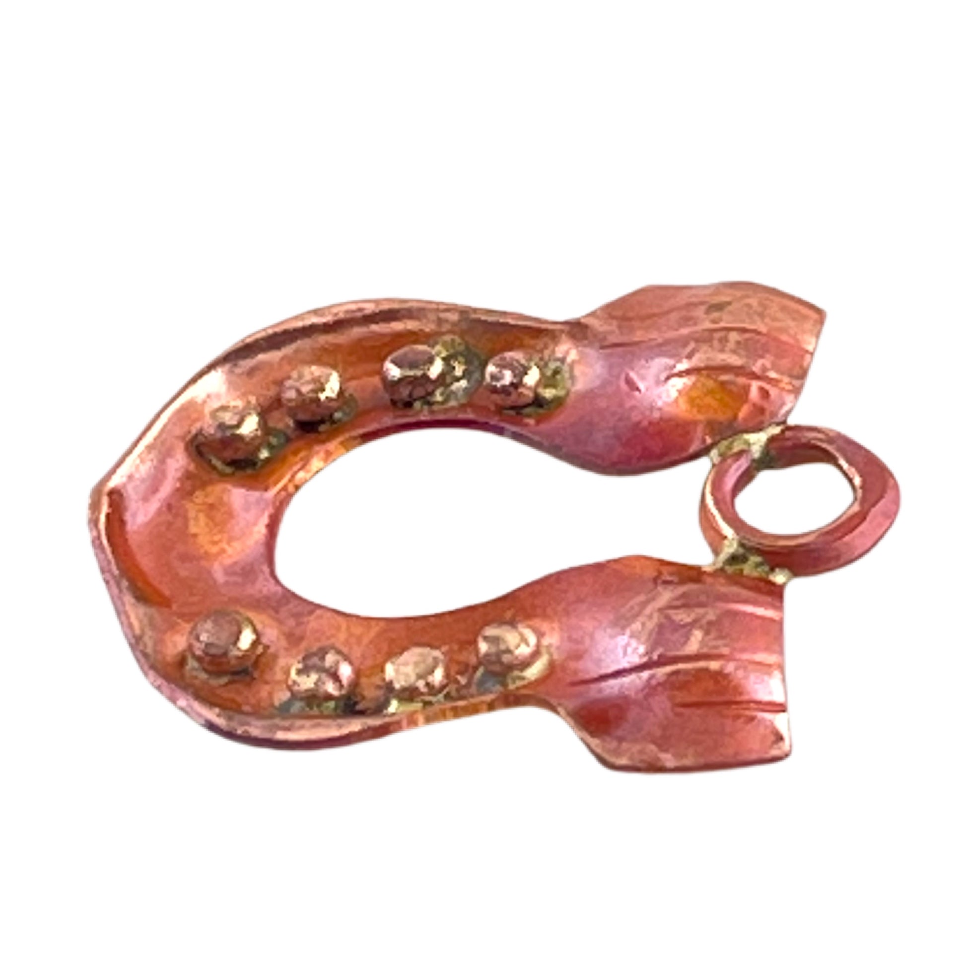 Rustic luck and timeless western spirit come alive in this small horseshoe charm. Crafted from genuine copper with warm brass accents, each piece is flame-torched to develop a rich red patina and sealed for lasting beauty. The stamped detail adds texture, making it perfect for earrings, bracelets, or as a tiny pendant in your handcrafted designs. Rooted in medieval European tradition, horseshoes have long symbolized protection against evil and bring a bit of cowboy charm to your creations.