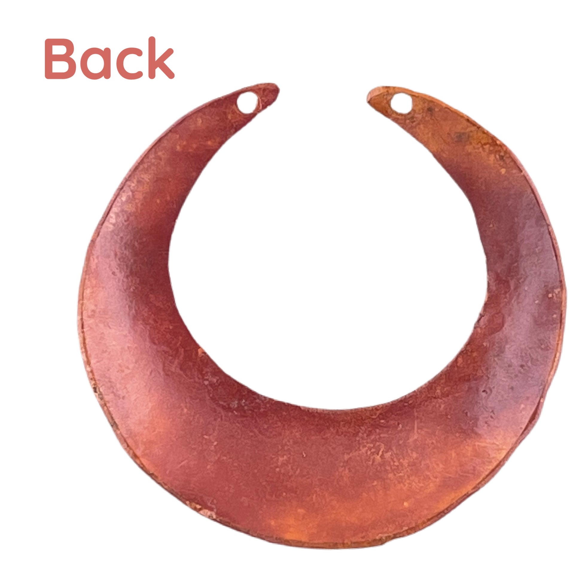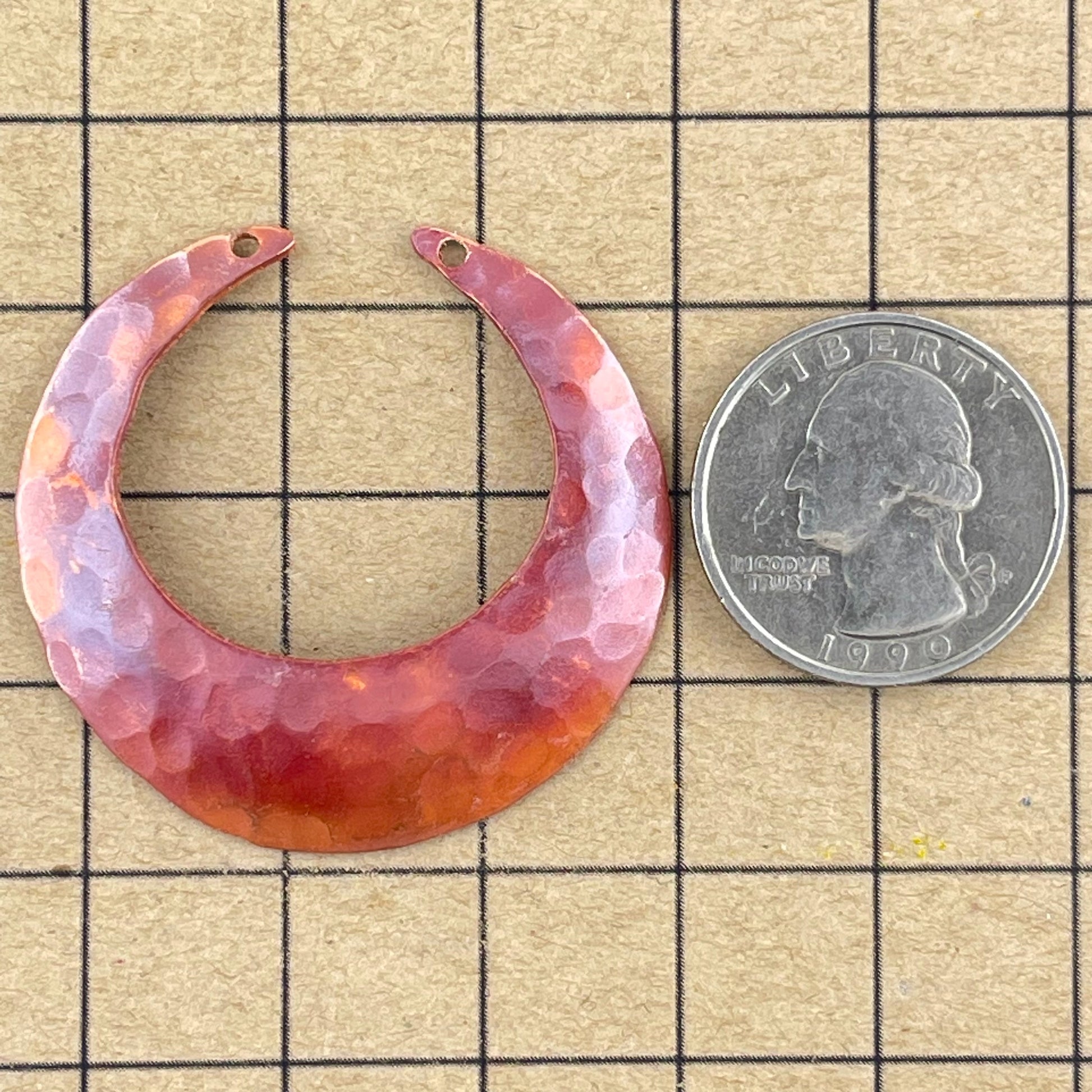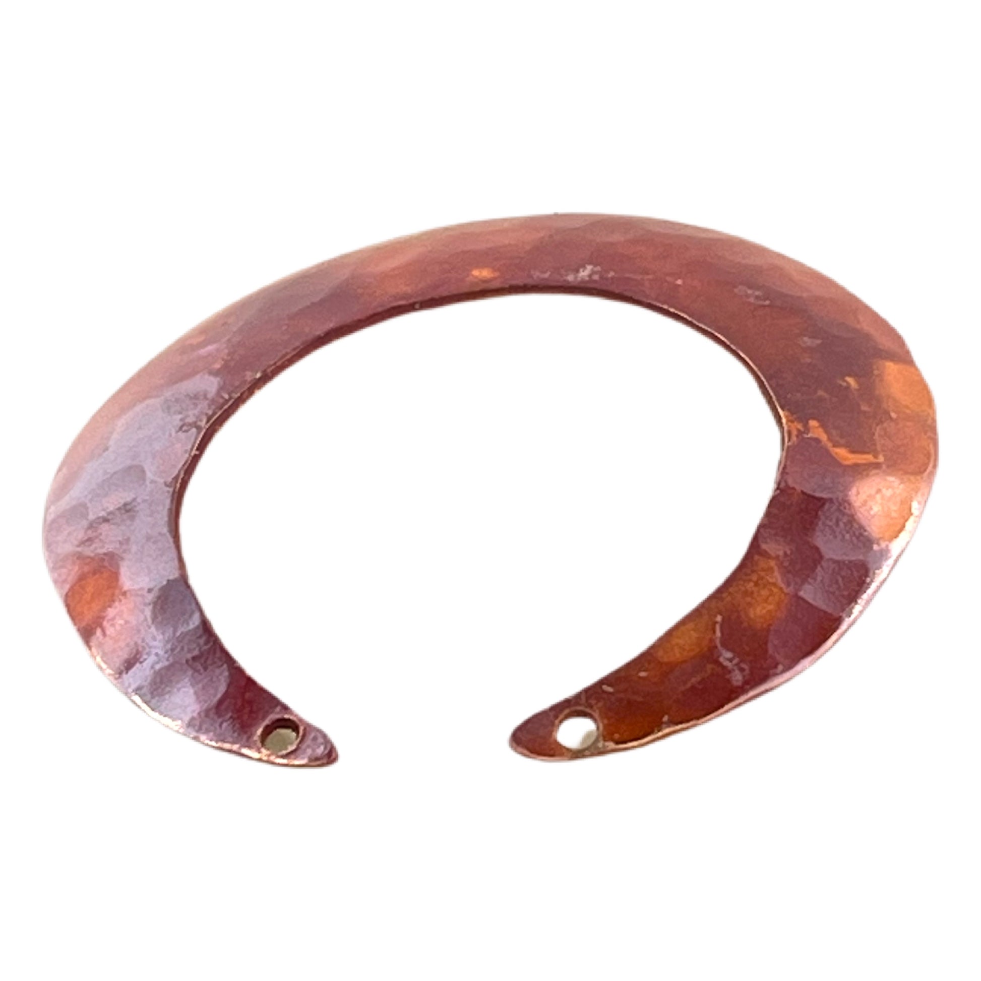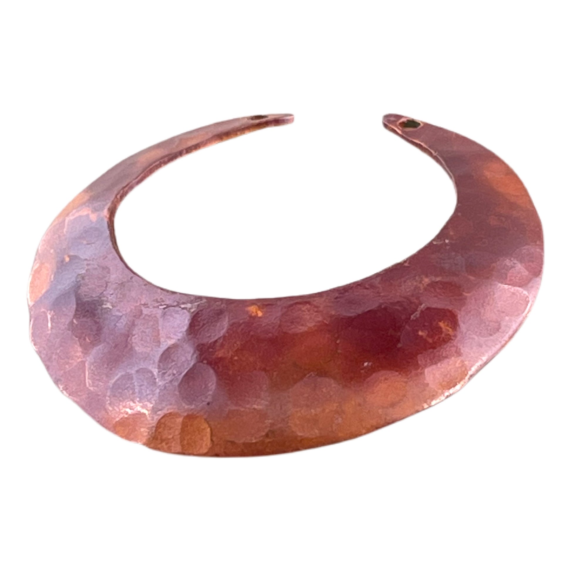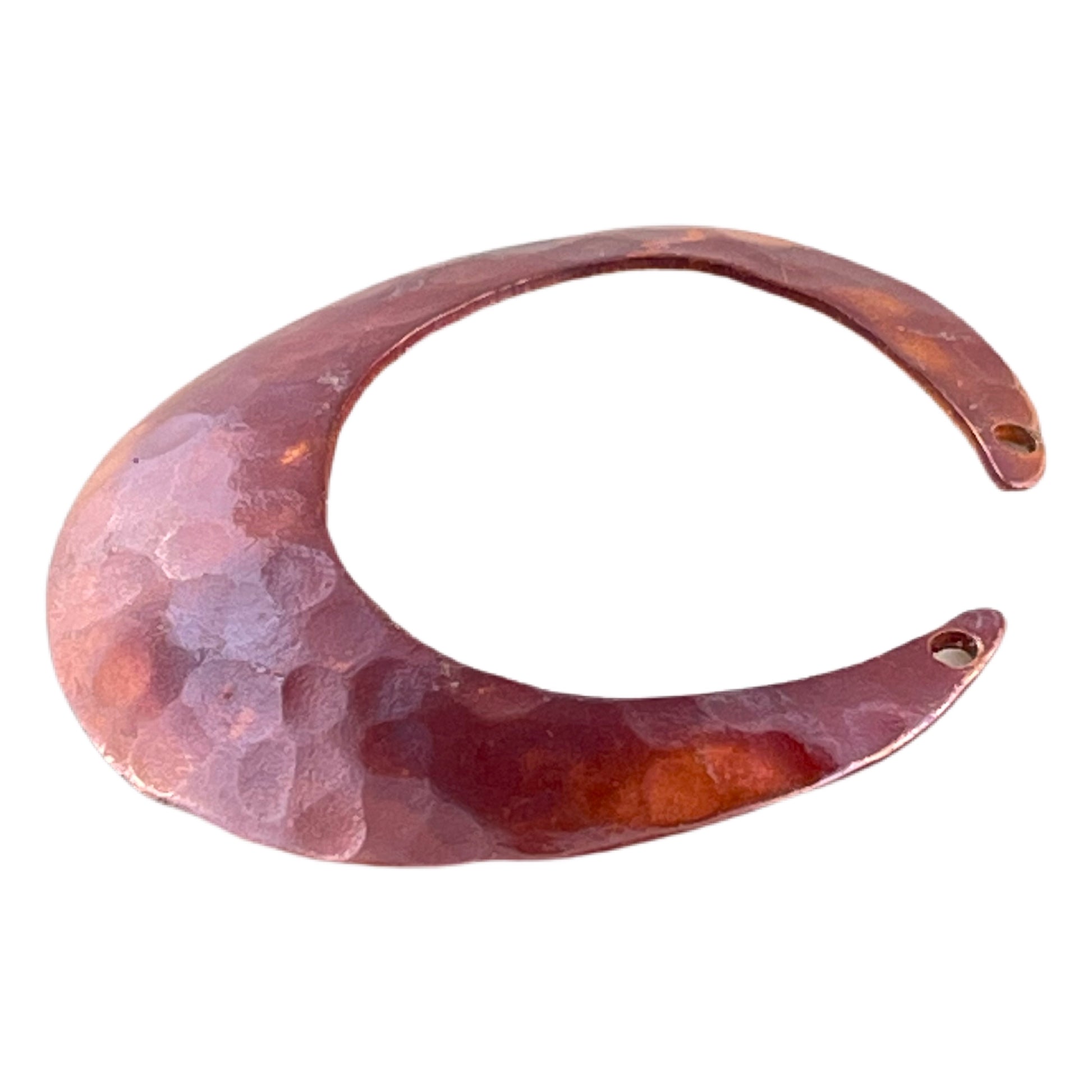With a touch of boho elegance, this large crescent moon pendant shows off a richly hammered surface and a slightly domed shape that gives it added presence. Flame-torched copper reveals warm shades of russet and orange, sealed to help protect the color. Drilled at the top, it’s versatile enough for necklace designs or for creating larger, lightweight earrings with an organic edge.