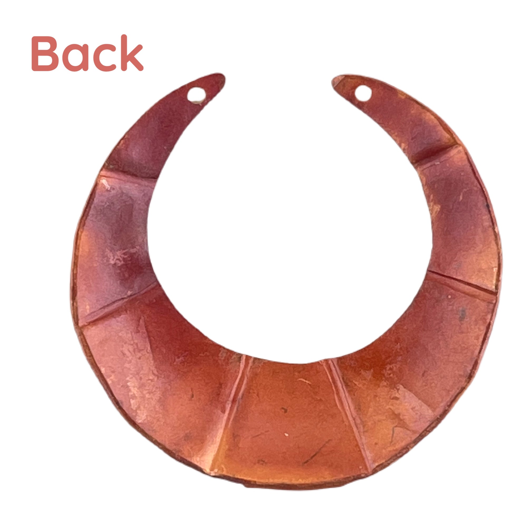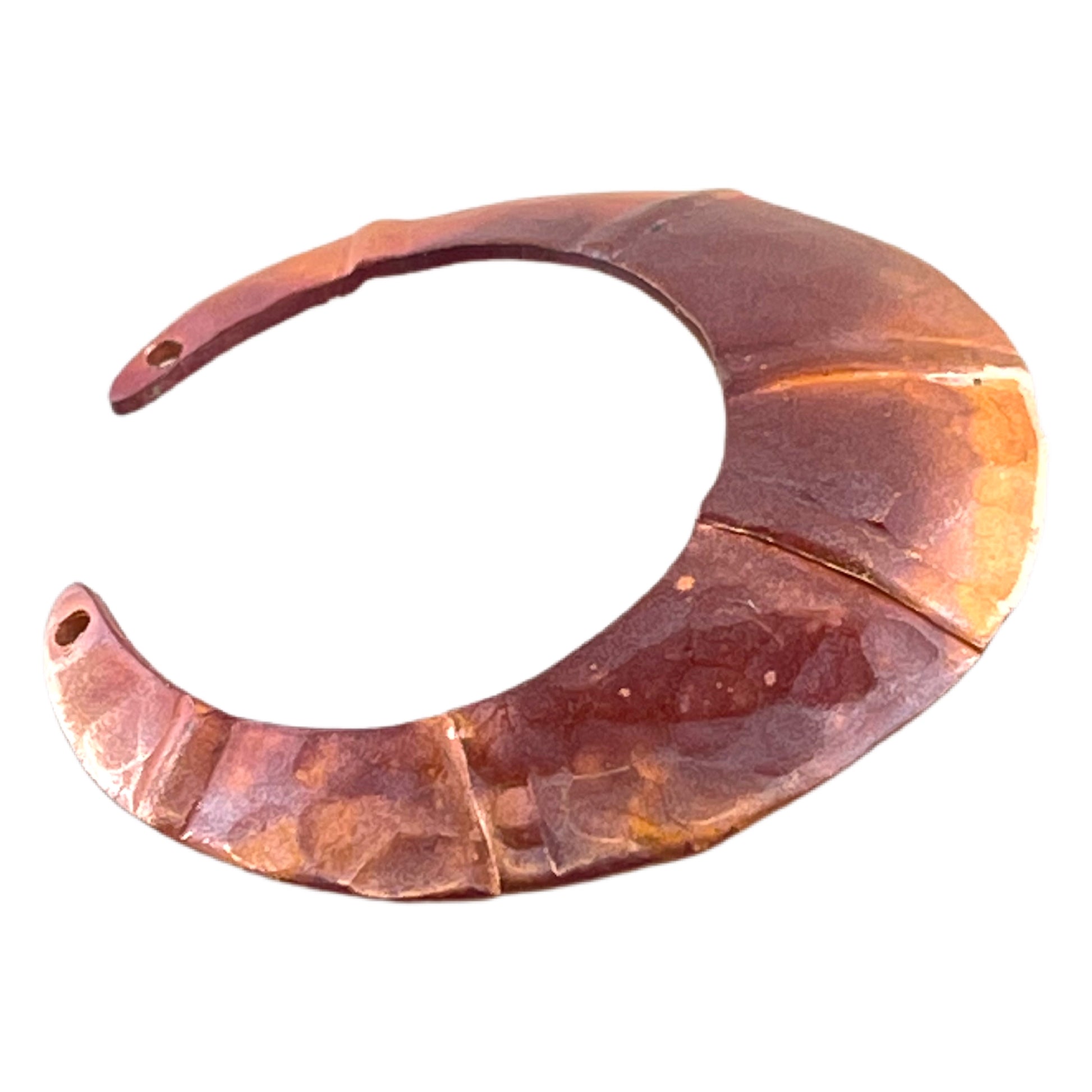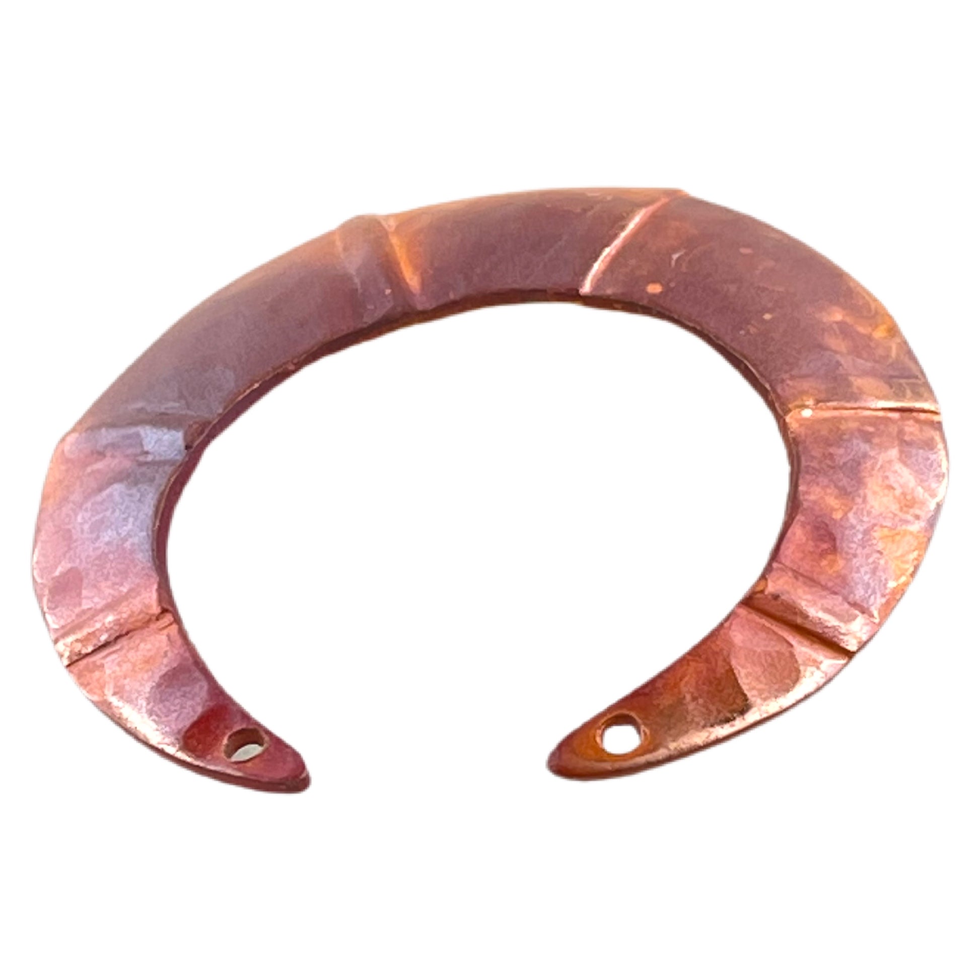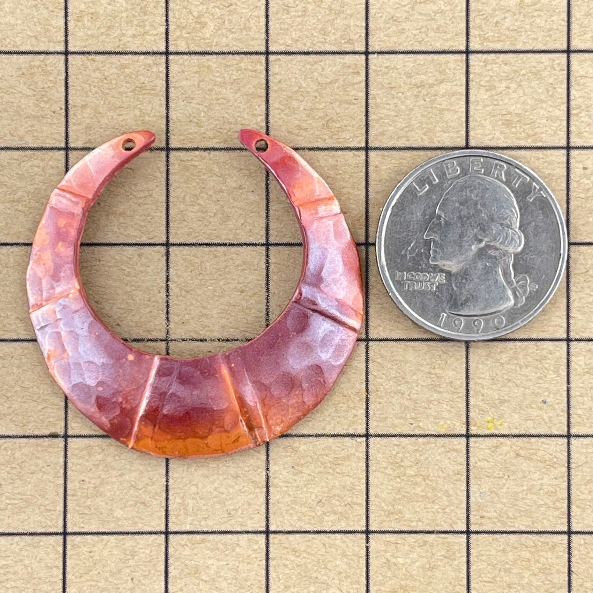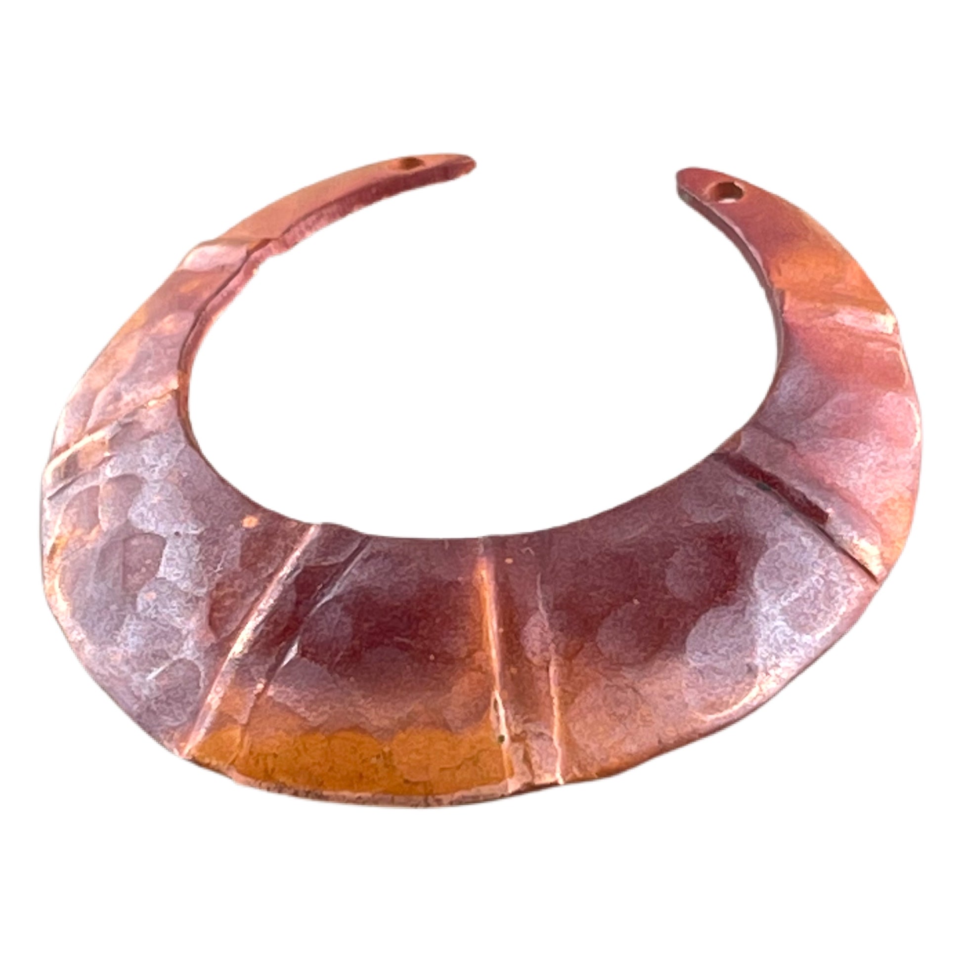 Hammered by hand, this crescent takes on a sculptural feel with grooved lines that break up the hammered surface. The flame-torched copper shifts from russet to red-orange, giving it a warm, rustic character. Small top holes make it easy to use as bold earrings, while its curved shape also lends itself to a pendant... one that can hold your reading glasses in a creative, functional way.