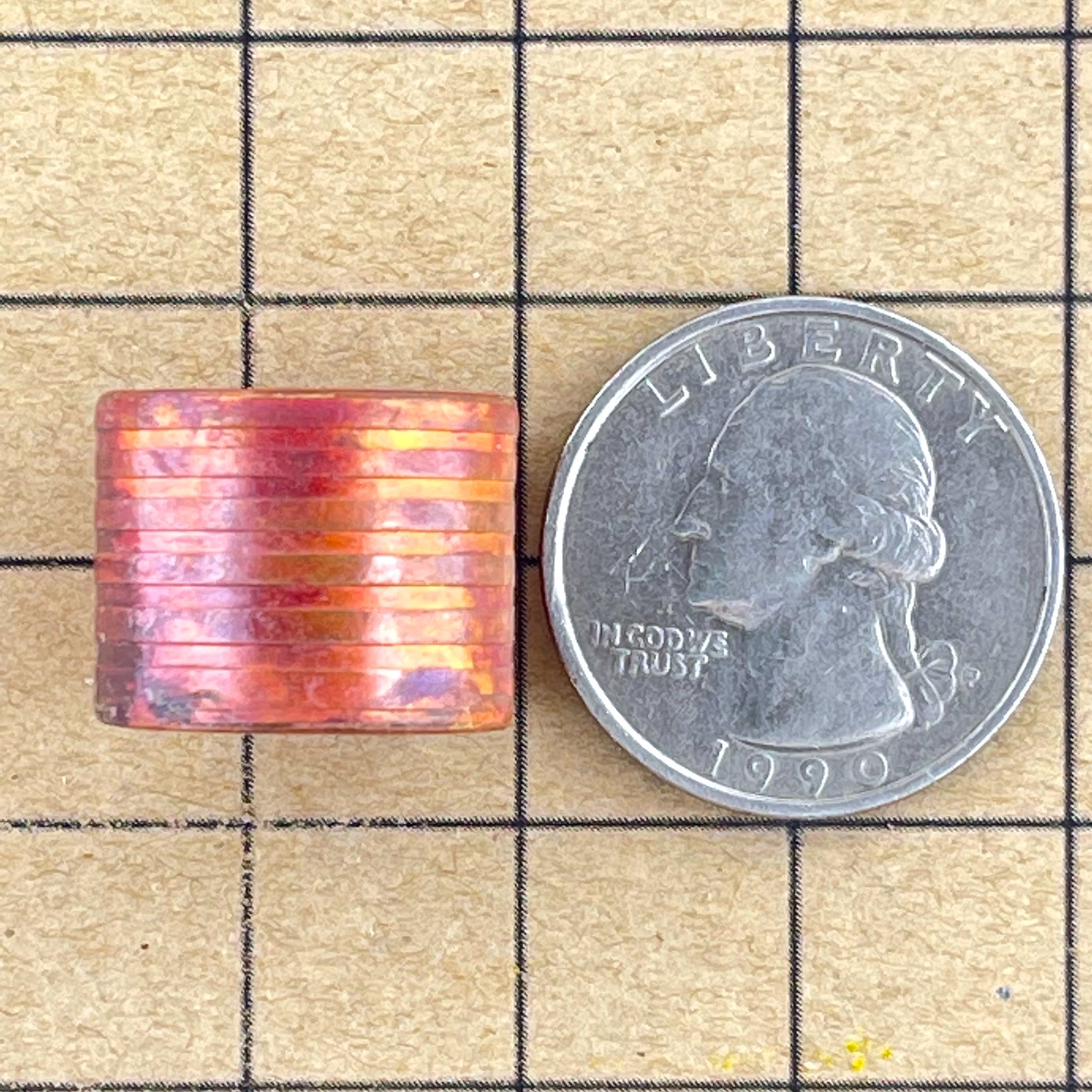 With its smooth cylindrical shape and bold size, the large copper barrel bead adds a strong artisan presence to your designs. Flame-patinated in deep reds and oranges and sealed for durability, it works beautifully as a focal or spacer. One of four sizes in a graduated series, it’s ideal for creating balanced, rustic necklaces or standout accents in bracelets and earrings.