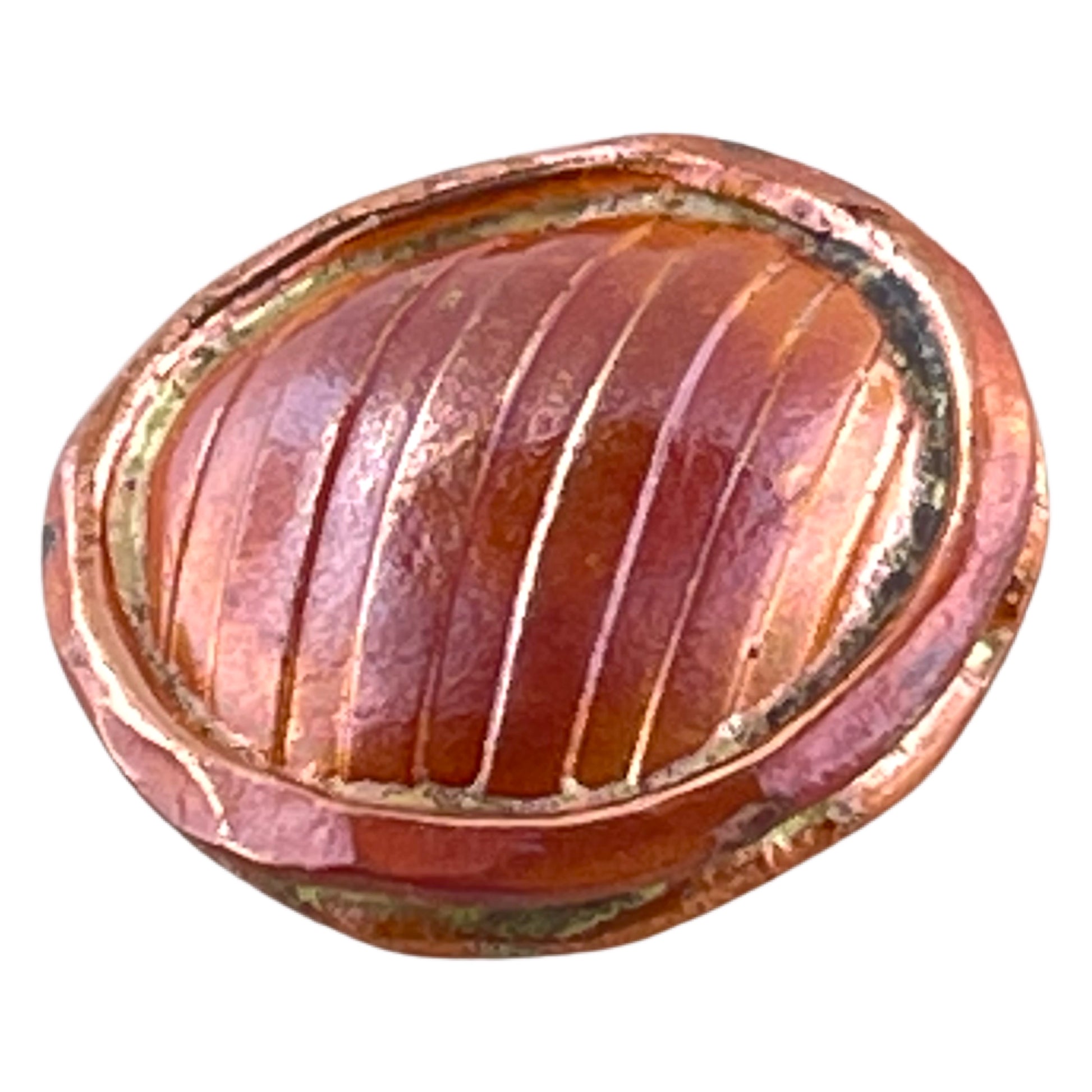 Textured by hand and rich with color, the puffy round bead adds bold character to your designs. Its double-sided form is slightly domed, featuring strong vertical lines created using the repoussé technique. Torch-fired for deep orange and red hues, sealed for durability, and accented with bronze solder, it’s a striking focal for earrings or a standout in layered necklaces.