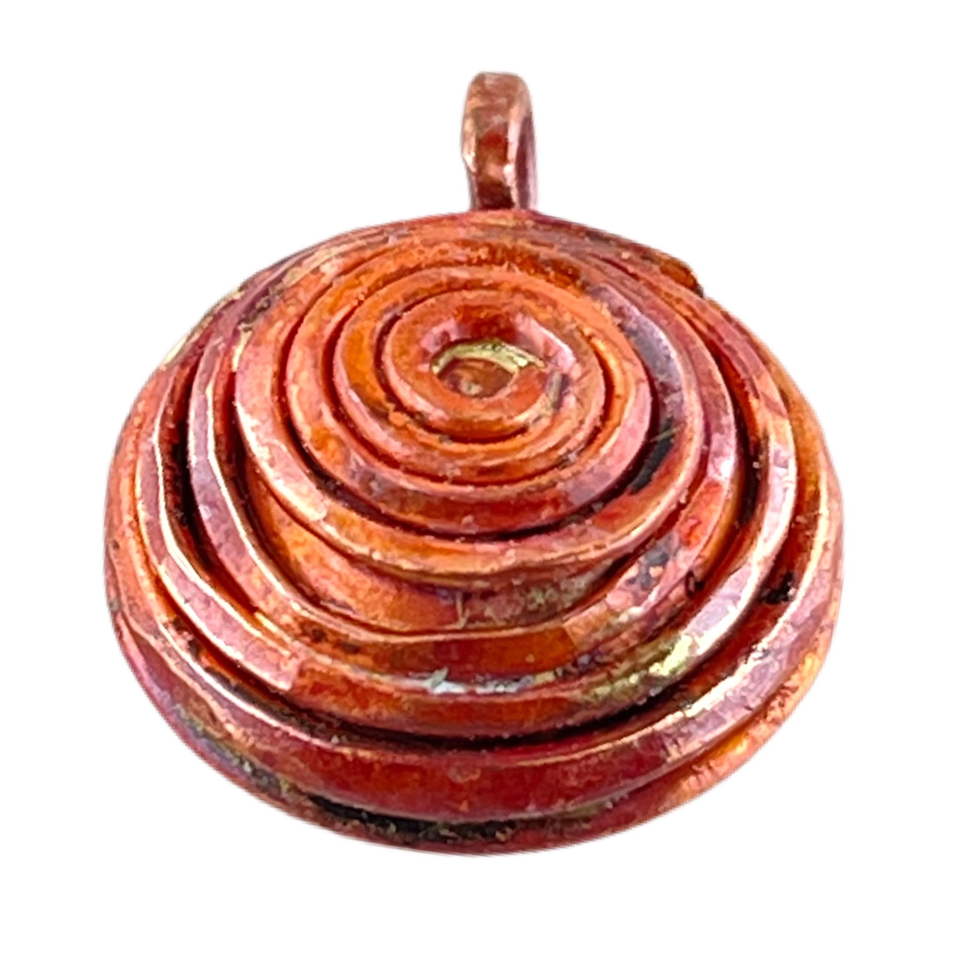 A softly rounded spiral charm with a pleasingly puffy shape that feels substantial without being bulky. The reverse side shows a linear textured pattern, giving you two distinct looks in one piece. Made entirely of copper, it’s heat-treated to bring out a rich, deep red patina and carefully sealed to help maintain its color over time. Sized perfectly for earrings or shorter necklaces, it carries a handcrafted feel that fits naturally into your designs.