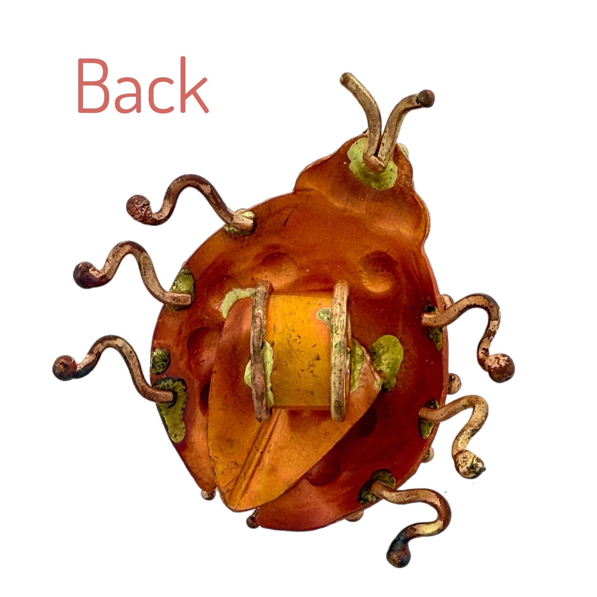 This handcrafted beetle pendant brings playful motion to your jewelry designs. Sculpted in copper with brass wire accents, with a hammered texture and our signature red flame patina. The curving legs and stylized antennae give it a touch of whimsy, while the embossed dots across the shell add rich dimension.