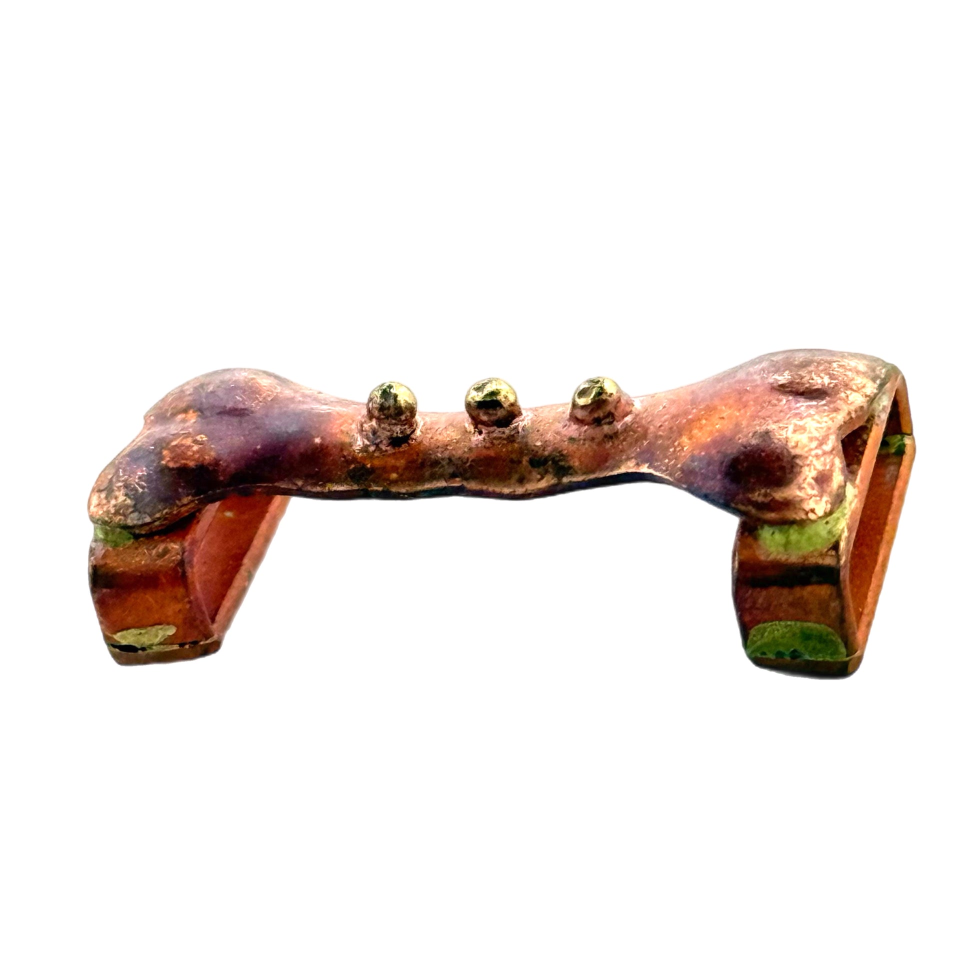 Compact but full of character, this bone-shaped slider is crafted from copper and accented with three small brass balls across the center. It’s a perfect fit for 10mm flat leather, whether you’re designing for a dog lover, or just drawn to strong, sculptural bone shapes.