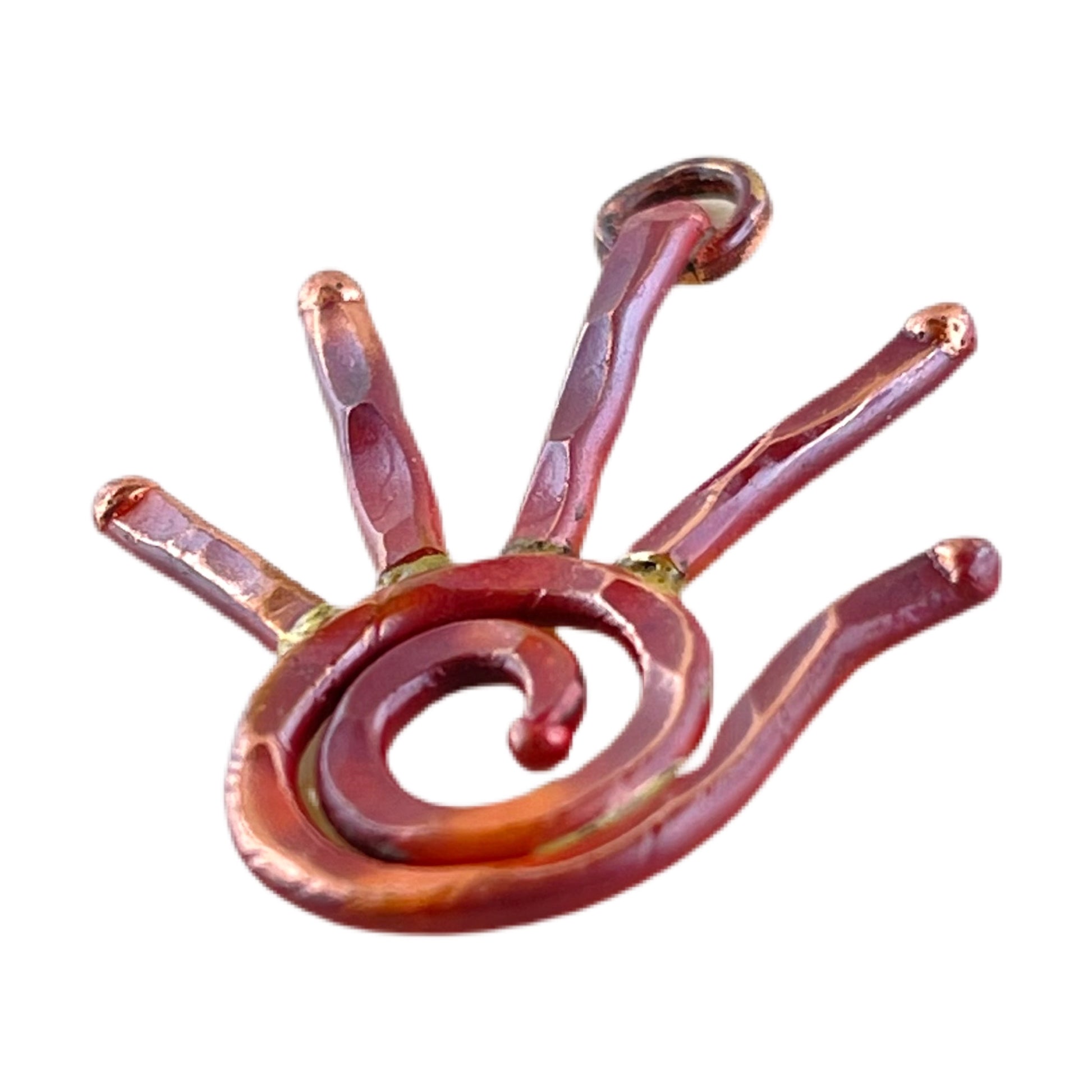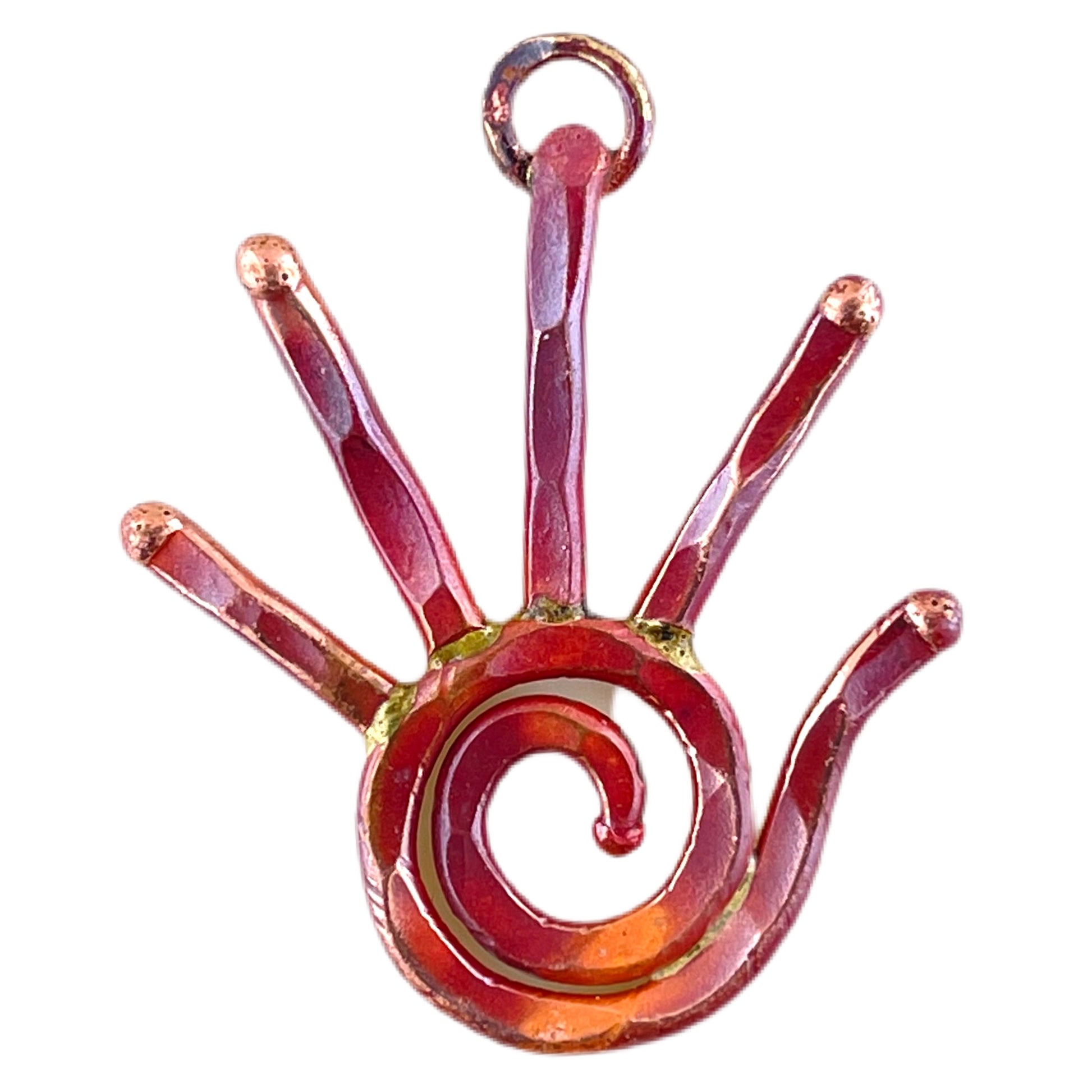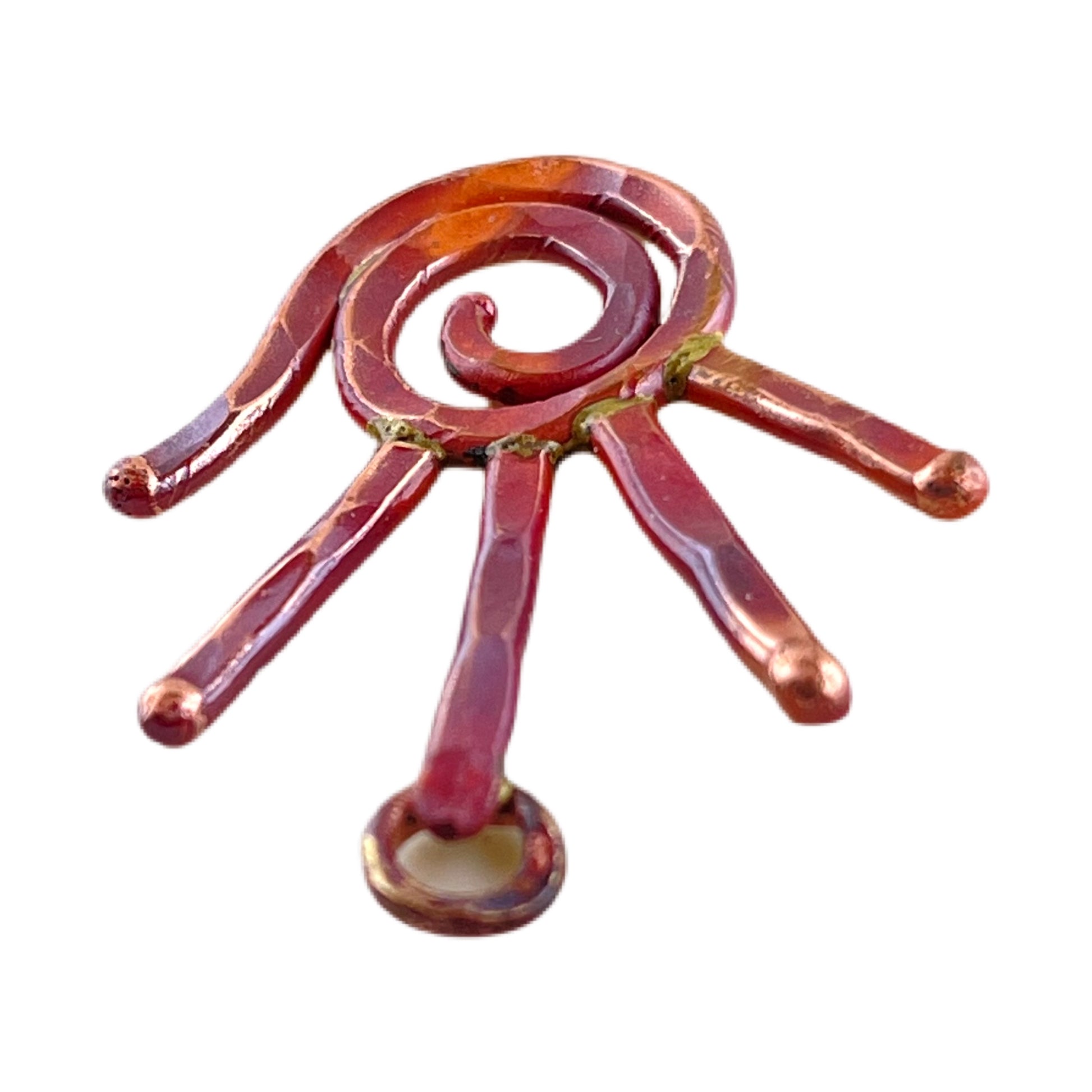 Original Artwork by Patricia Healey ~ Each gorgeous genuine copper bead and pendant is handmade from sheet metal. First we cut the shapes out, then put form to metal using the technique of “Repousse”, (beating the crap out of the metal from the reverse side giving it form). We use a bronze solder which you can sometimes see as bits of gold peeking through the solder seams. To get the rich colors we use our top secret patination formula and then fire it up with a torch. Finally, the color is sealed in with a metal lacquer.