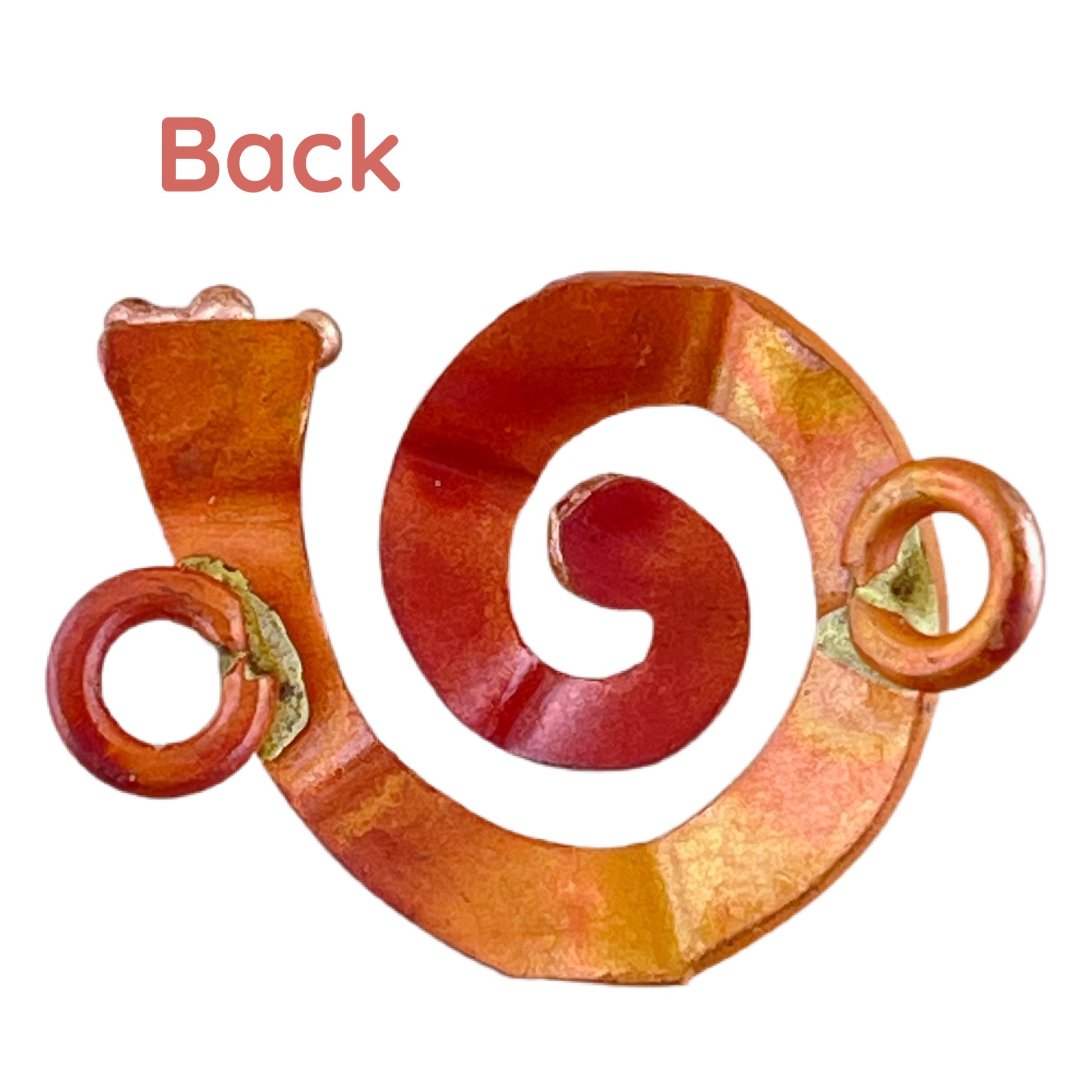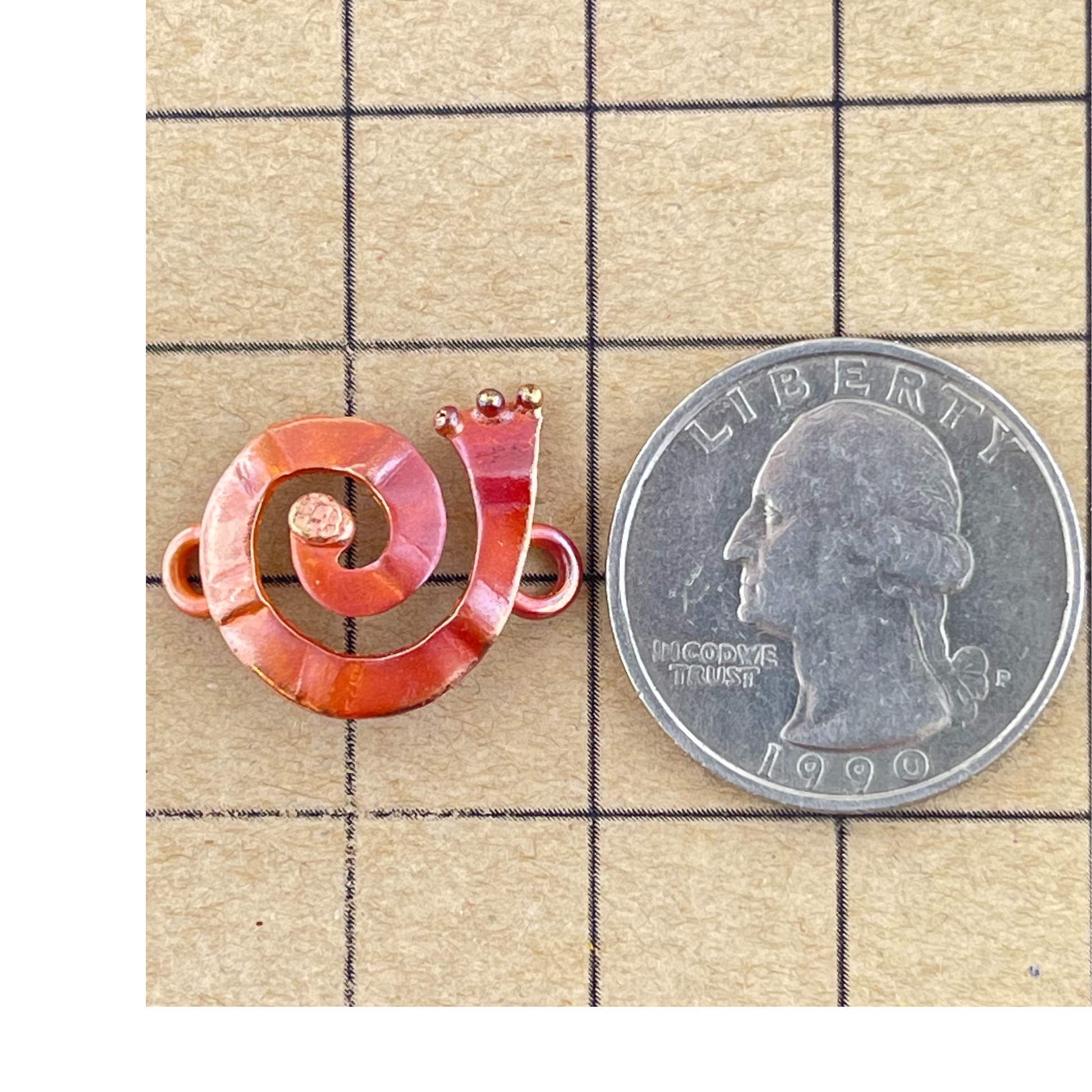 A graceful spiral captured in genuine copper with brass highlights, this right-facing spiral link brings subtle movement and charm to handmade earrings, necklaces, and bracelets. Flame-torched to develop a rich red patina and sealed for lasting beauty, it features soldered rings on each side for easy attachment. Perfect as a connector for bracelets and necklaces or as a copper charm accent in earrings, it invites creativity in every artisan jewelry design.