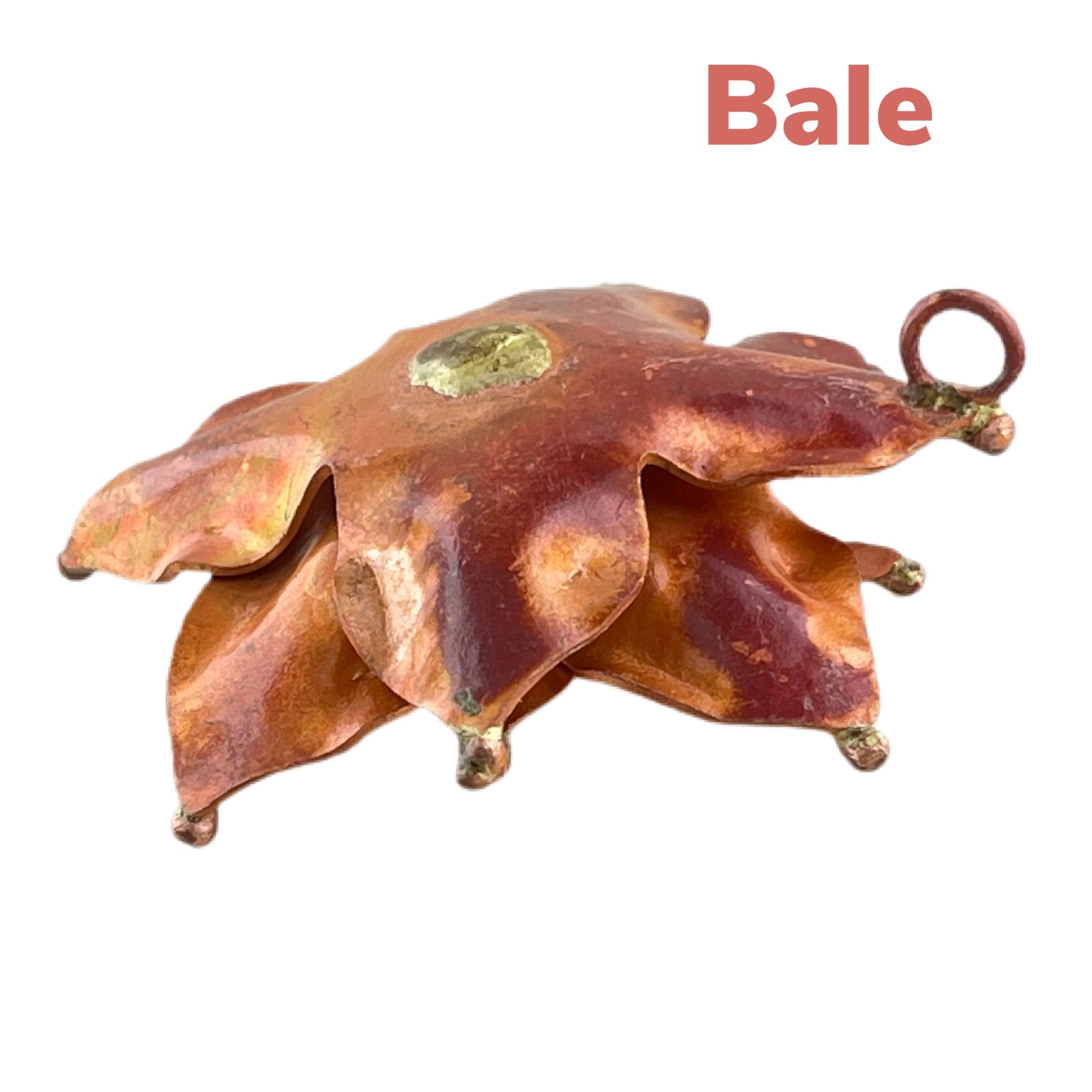 A striking focal point for necklaces, this pendant offers artisan quality and floral elegance for jewelry designers who appreciate bold, handcrafted components. This bold three-layered flower pendant is handcrafted from solid copper with rich brass accents that add contrast and warmth. Each petal is shaped using the repoussé technique and finished with hand stamping to create dimensional texture throughout the design. A torch-fired red-orange patina gives the piece its signature glow, sealed for durability.