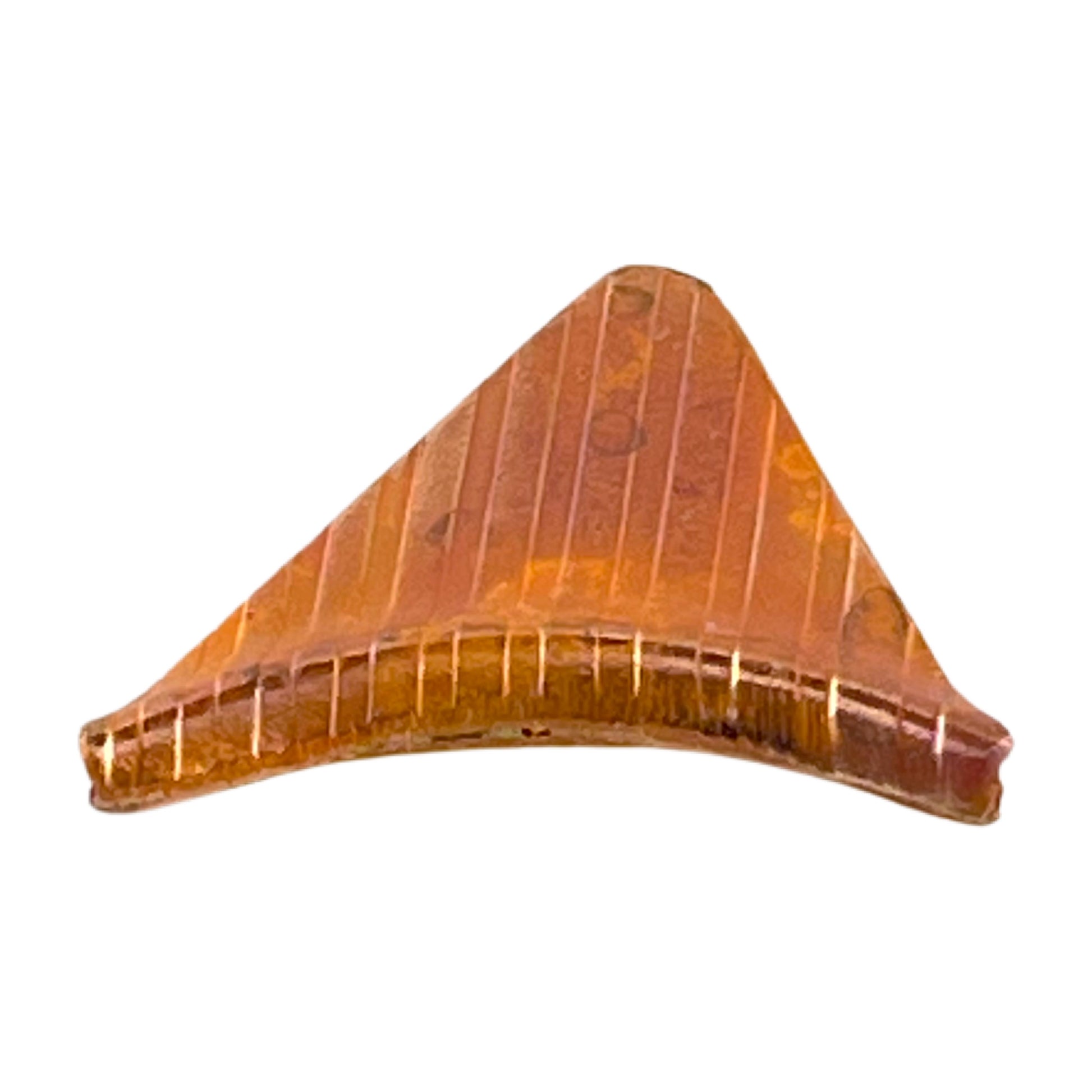 This handcrafted copper triangle bead adds structured detail to your jewelry designs. One side features strong vertical lines, while the reverse offers a more intricate, screen-like texture, giving you two distinct looks to work with. The flame-patinated finish produces a range of oranges and reds, then sealed to preserve the color. The stringing channel sits along the top edge with a slight curve, adding a subtle design detail that enhances its visual interest and orientation. Ideal for necklace layouts with a rustic or geometric edge.