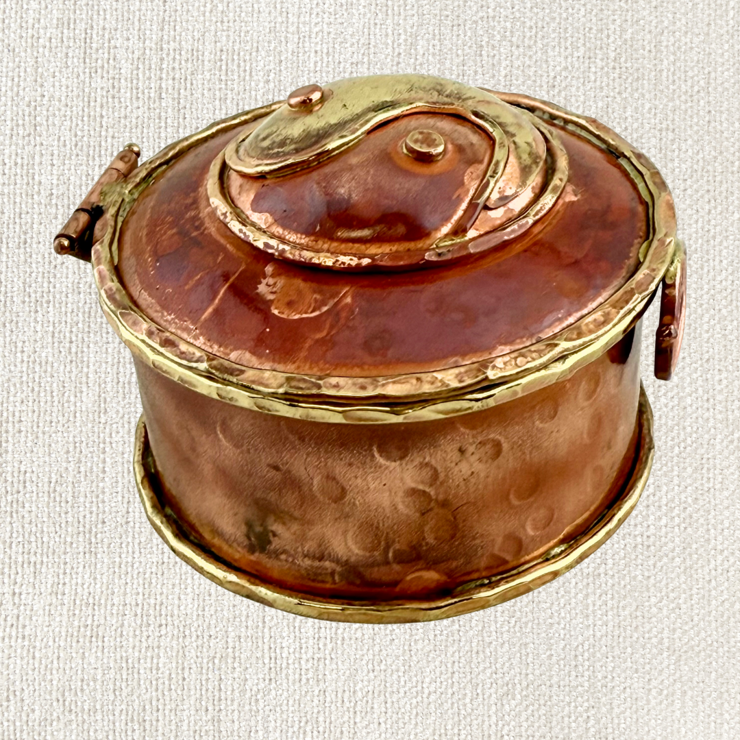 In Chinese philosophy, yin and yang represent balance, light and dark, stillness and motion, each giving rise to the other. This handcrafted box brings that symbol to life using repoussé, lifting the metal from the reverse side to create a domed, sculptural form.
