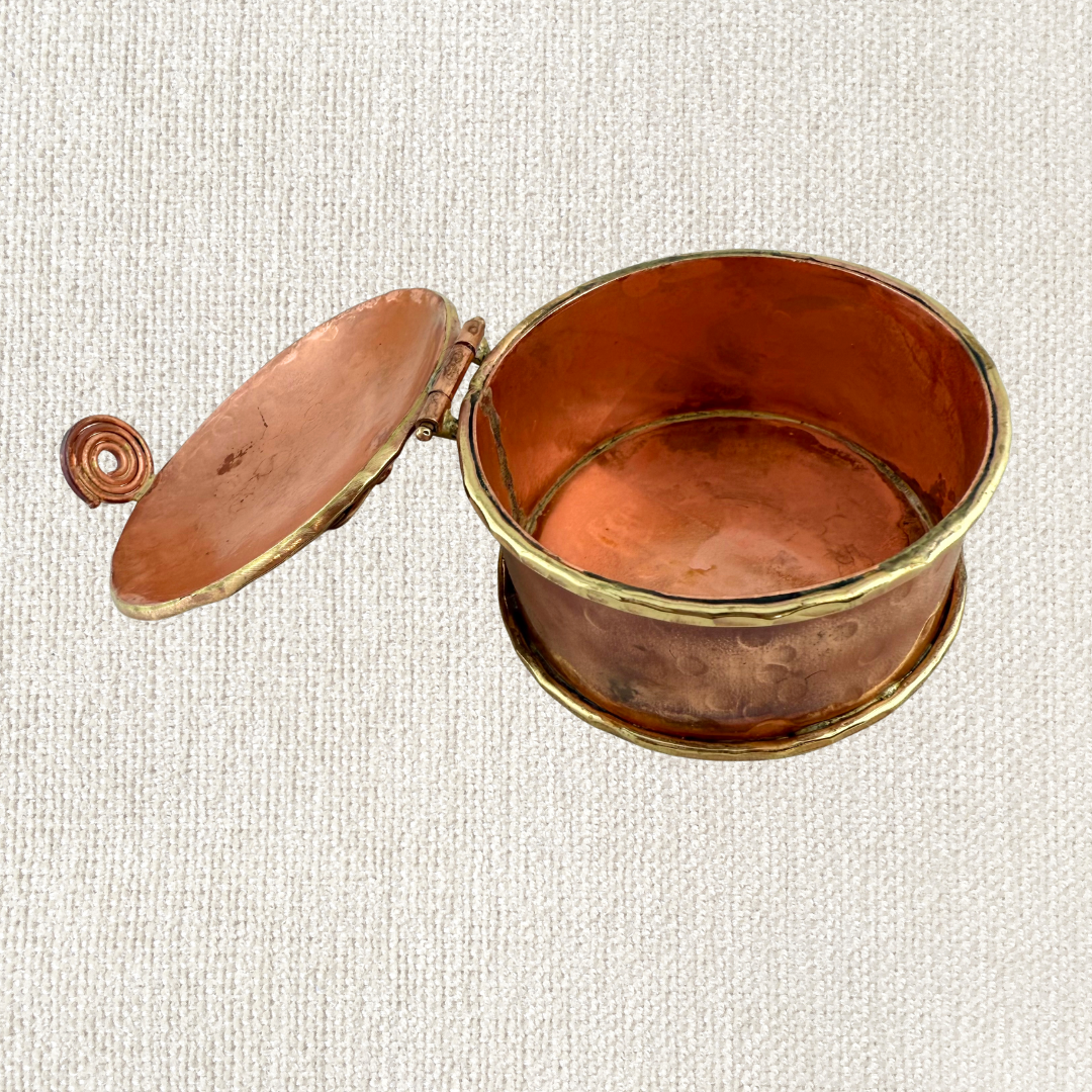 Made from flame-colored copper and accented with brass, the lid closes with a forged copper spiral that doubles as a design element. The inside is ready to hold your smallest treasures & tokens.